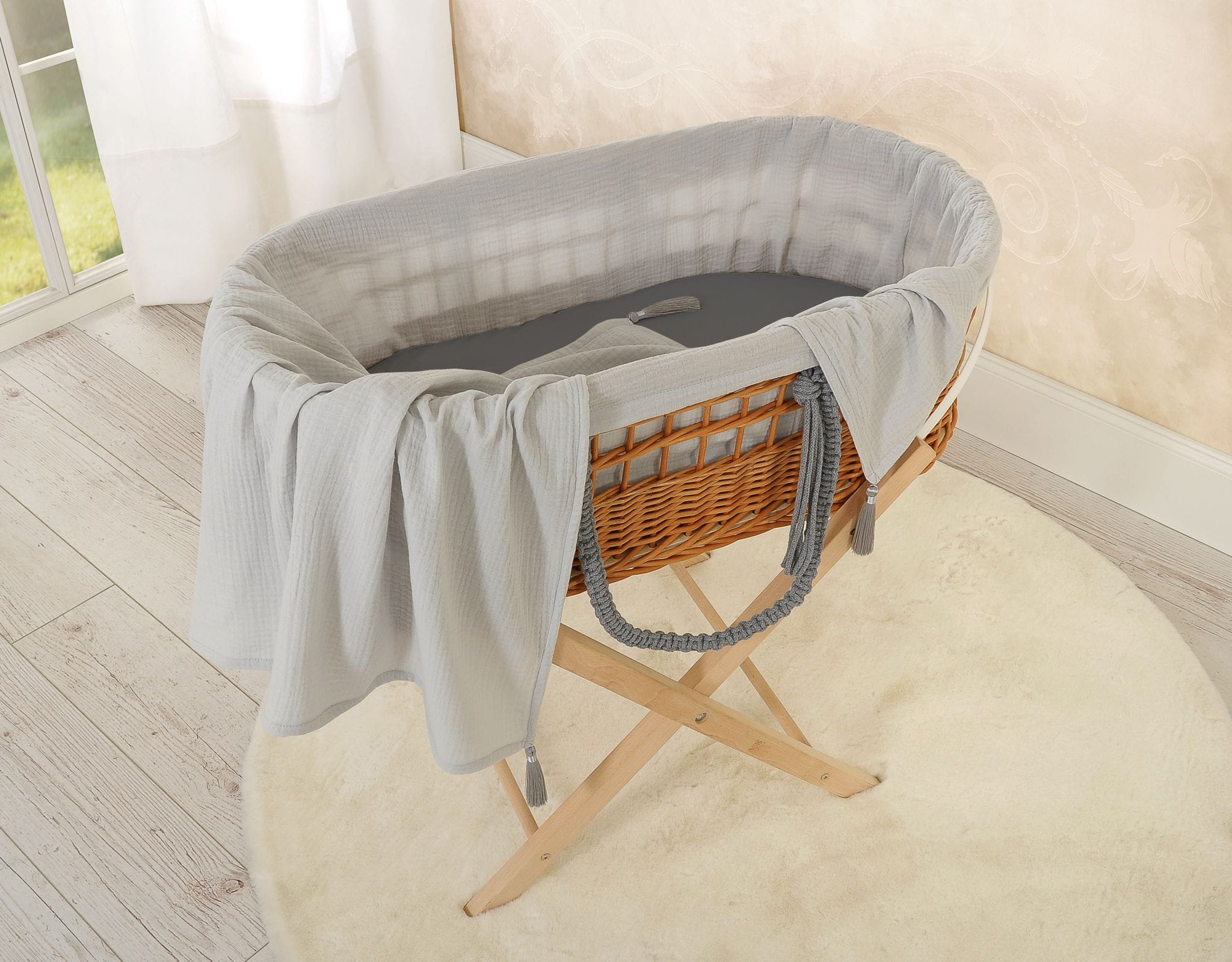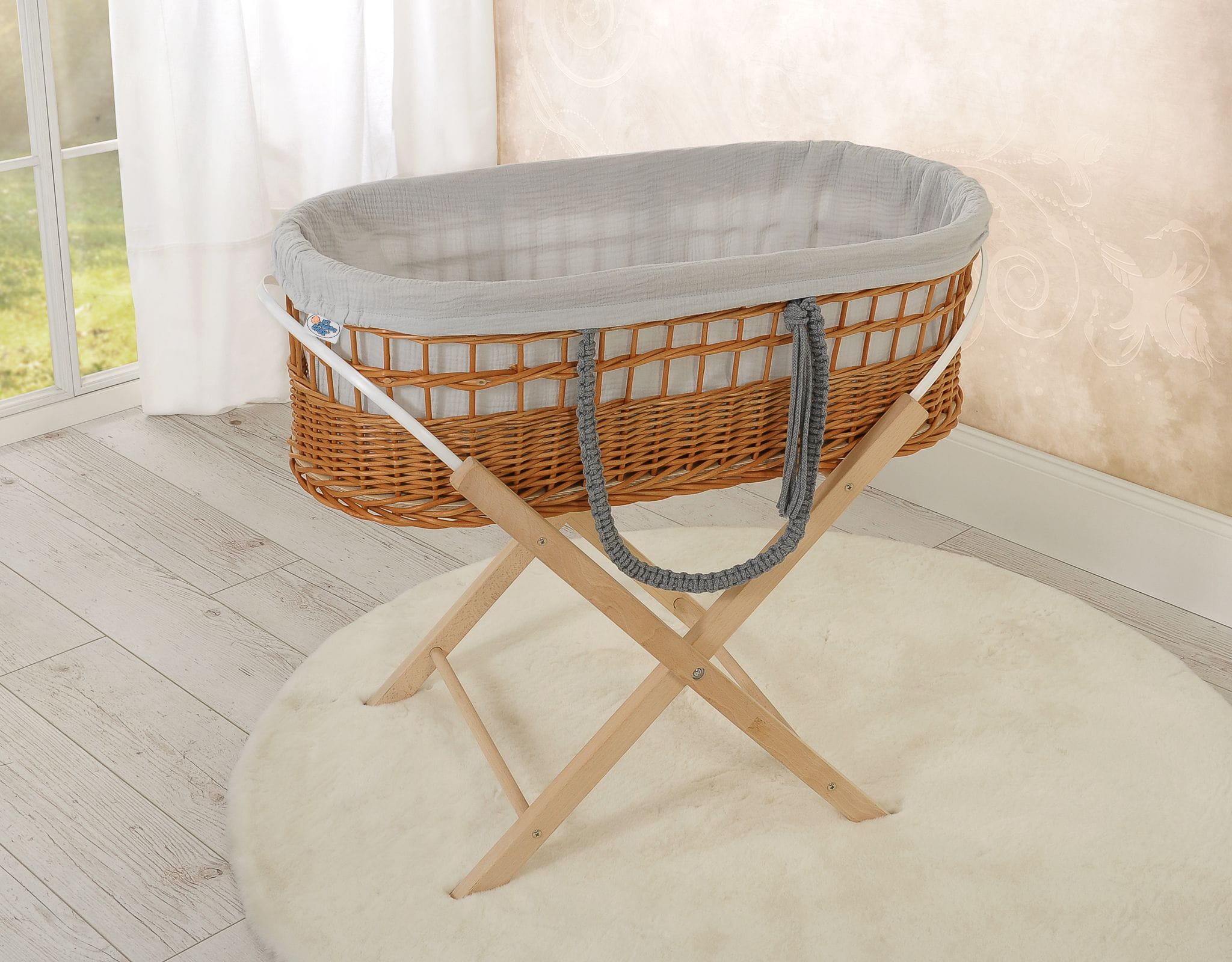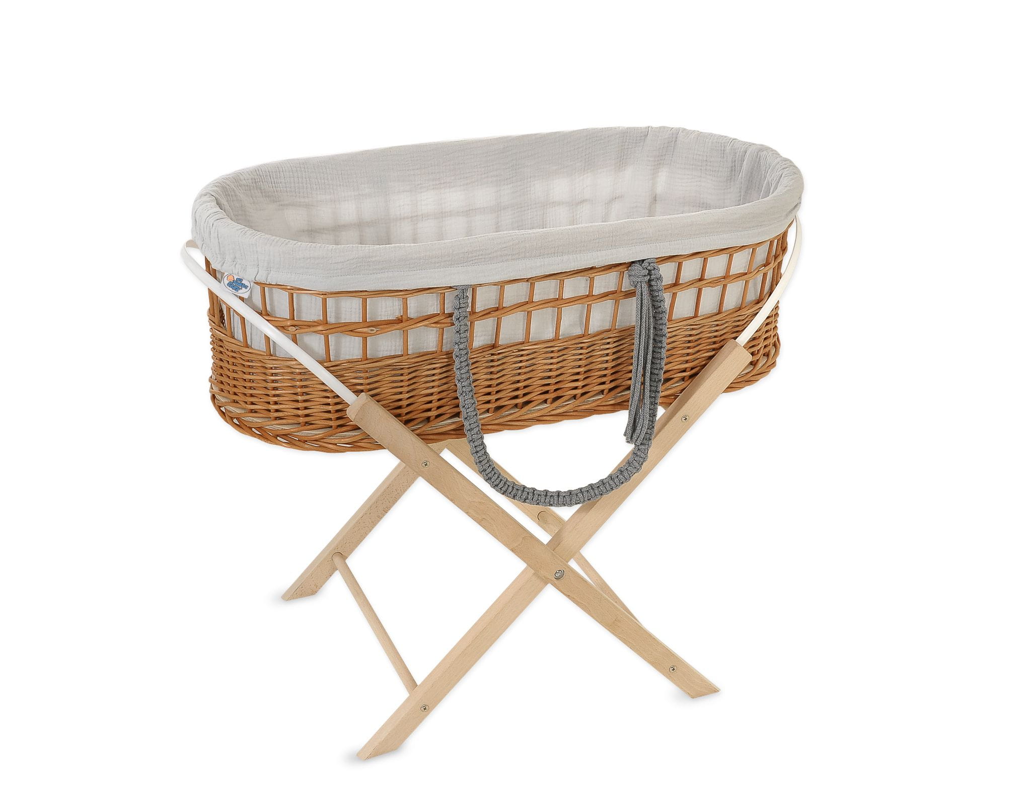 Kosz mojżesza BOHO wiklinowy ze stojakiem z wyściółką muślinową -szarą