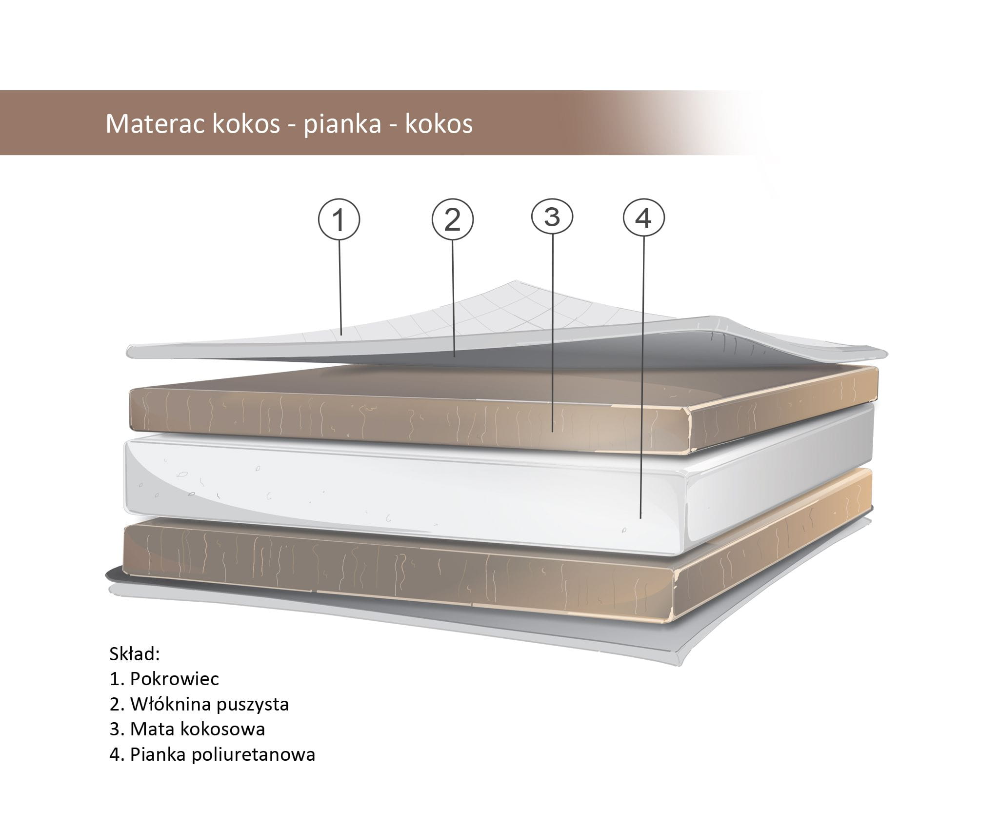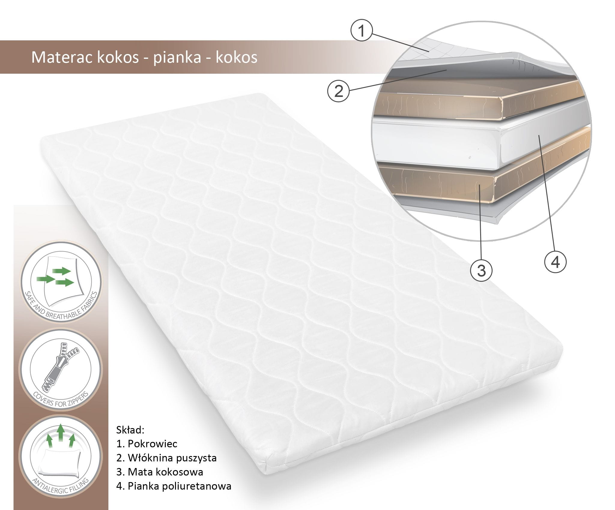 Górna i dolna warstwa materacyka to mata kokosowa - to naturalny surowiec stosowany w materacykach, oddychający i zapobiegający przegrzewaniu się Dziecka. Kokos ma także właściwości antybakteryjne, hamuje rozwój roztoczy.