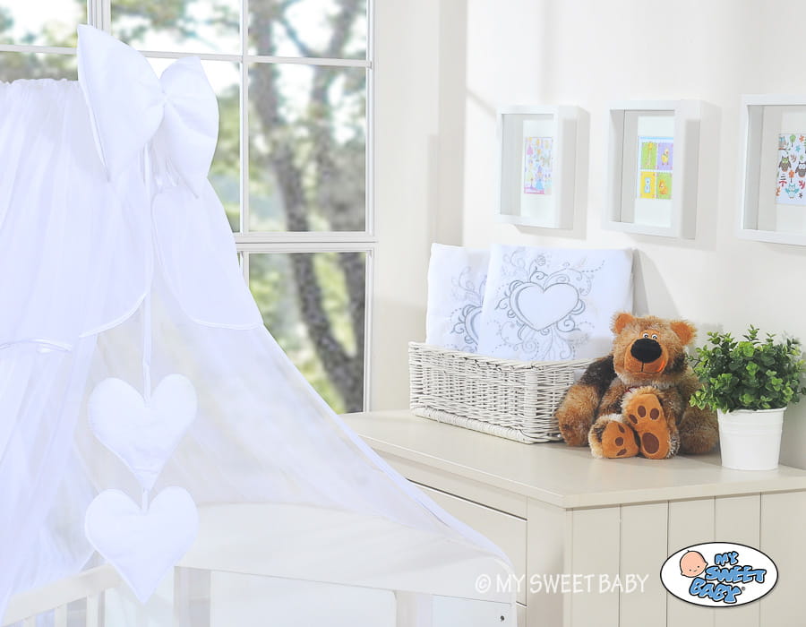 Wiszące dwa serduszka + duża gruba kokarda - Dwa wiszące serduszka z miękkim wypełnieniem to słodkie i niepowtarzalne uzupełnienie kompletu pościeli. Przyciągają uwagę dziecka w pierwszych miesiącach życia skutecznie zastępując karuzelkę. Duża gruba kokarda stanowi piękne zwieńczenie całości.