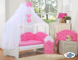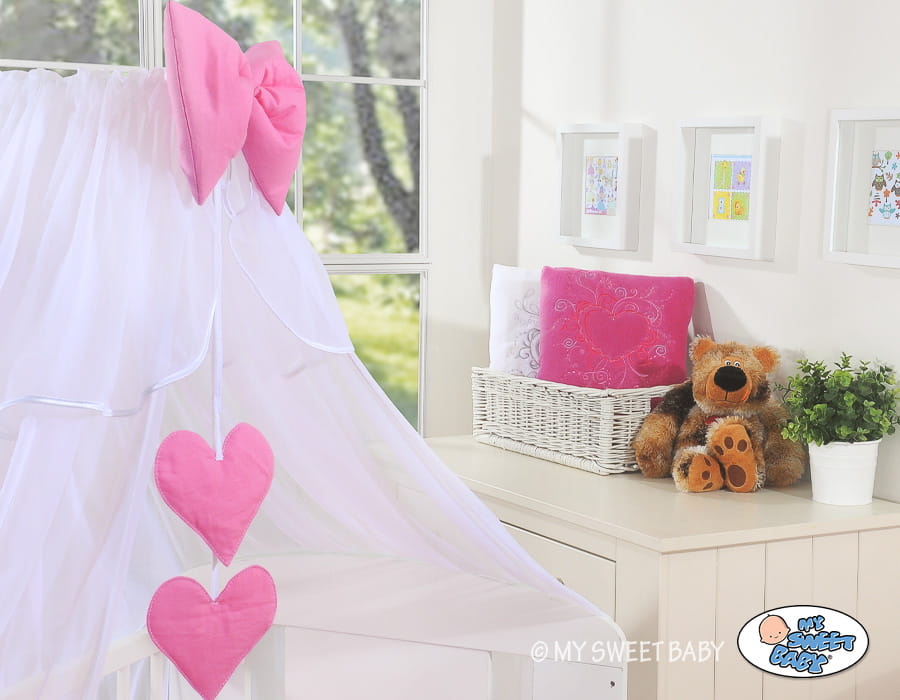 Wiszące dwa serduszka + duża gruba kokarda - Dwa wiszące serduszka z miękkim wypełnieniem to słodkie i niepowtarzalne uzupełnienie kompletu pościeli. Przyciągają uwagę dziecka w pierwszych miesiącach życia skutecznie zastępując karuzelkę. Duża gruba kokarda stanowi piękne zwieńczenie całości.