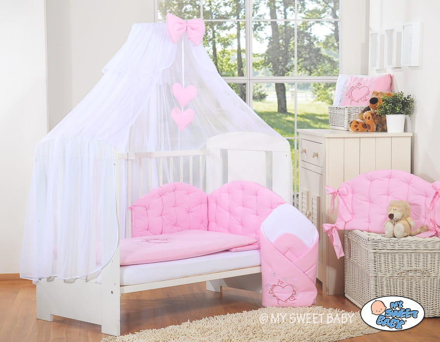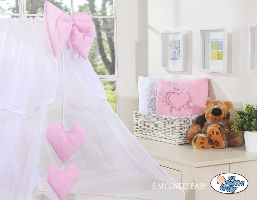 Wiszące dwa serduszka + duża gruba kokarda - Dwa wiszące serduszka z miękkim wypełnieniem to słodkie i niepowtarzalne uzupełnienie kompletu pościeli. Przyciągają uwagę dziecka w pierwszych miesiącach życia skutecznie zastępując karuzelkę. Duża gruba kokarda stanowi piękne zwieńczenie całości.