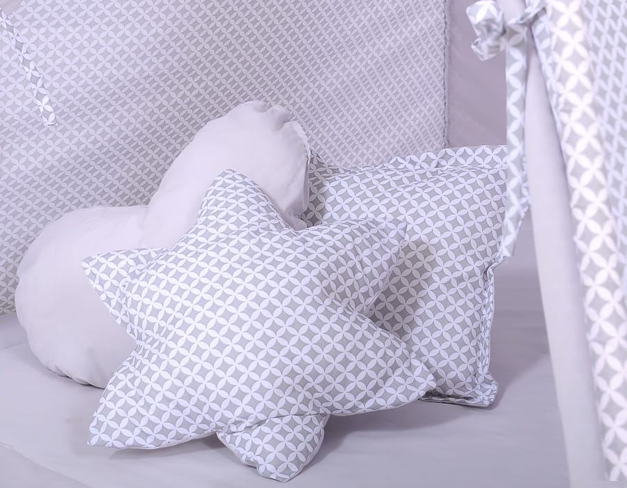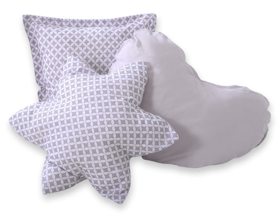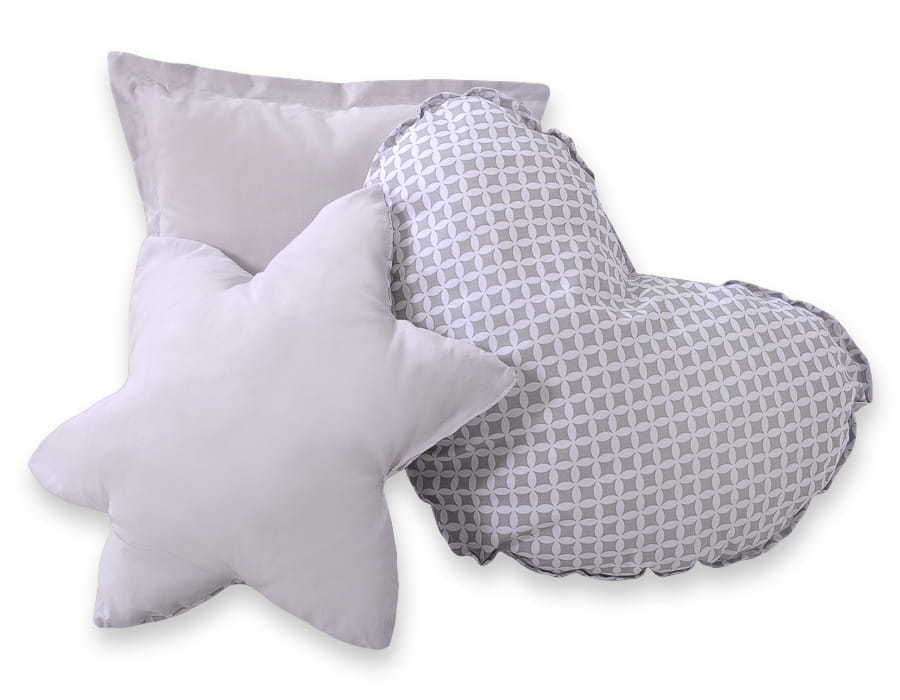 W komplecie zestaw 3 poduszek kolorystycznie dopasowanych do namiotu w trzech różnych kształtach: serduszko, gwiazdka i kwadratowy jasiek. Wykonane z najwyższej jakości atestowanej 100% bawełny, wypełnione specjalnym atestowanym włóknem - ECO FILLBALL.