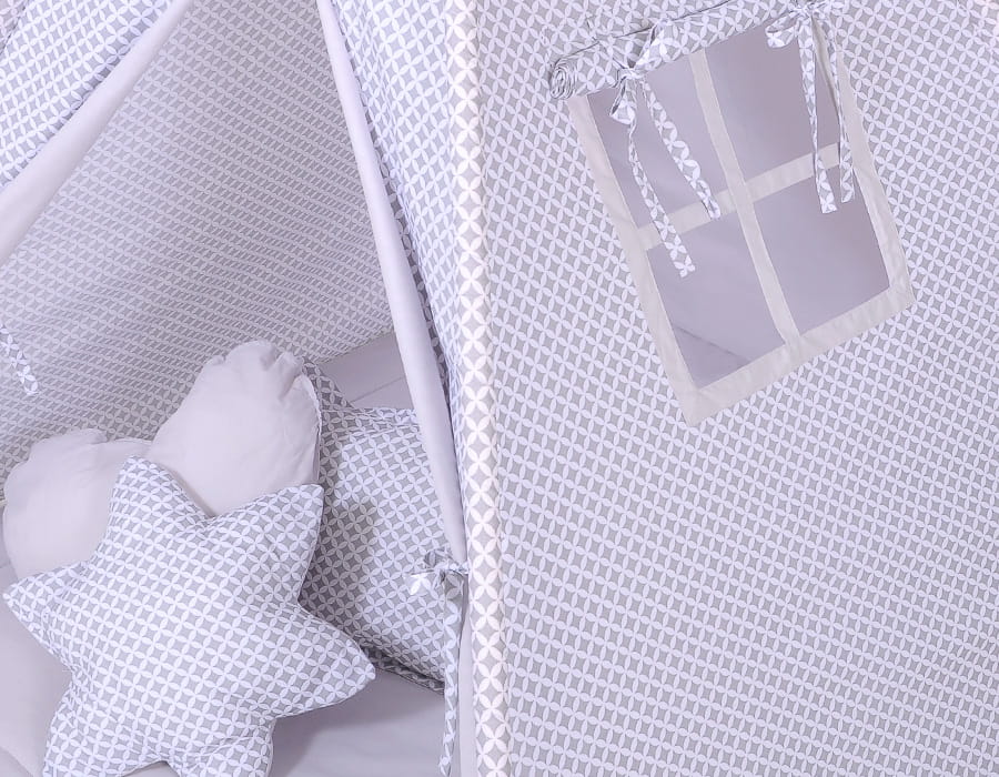 Namiot TIPI dla dzieci + mata + poduszki + zawieszki pióra - Mini-rozeta szara