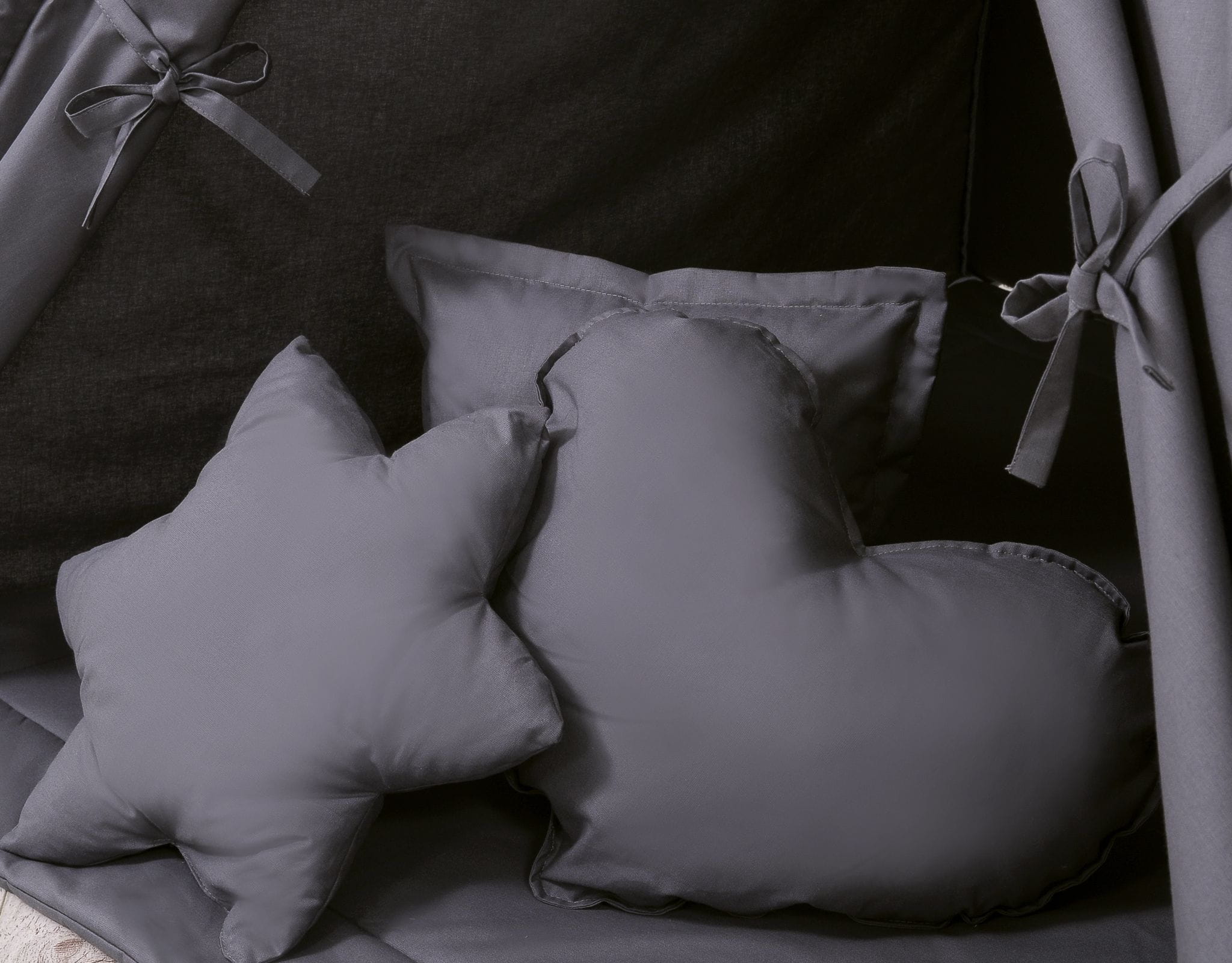 W komplecie zestaw 3 poduszek kolorystycznie dopasowanych do namiotu w trzech różnych kształtach: serduszko, gwiazdka i kwadratowy jasiek. Wykonane z najwyższej jakości atestowanej 100% bawełny, wypełnione specjalnym atestowanym włóknem - ECO FILLBALL.