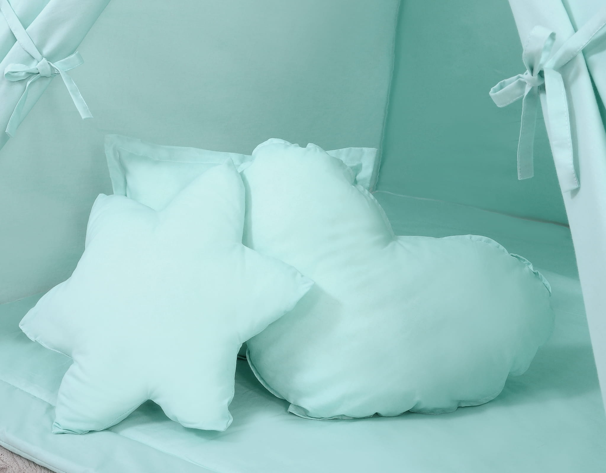 W komplecie zestaw 3 poduszek kolorystycznie dopasowanych do namiotu w trzech różnych kształtach: serduszko, gwiazdka i kwadratowy jasiek. Wykonane z najwyższej jakości atestowanej 100% bawełny, wypełnione specjalnym atestowanym włóknem - ECO FILLBALL.