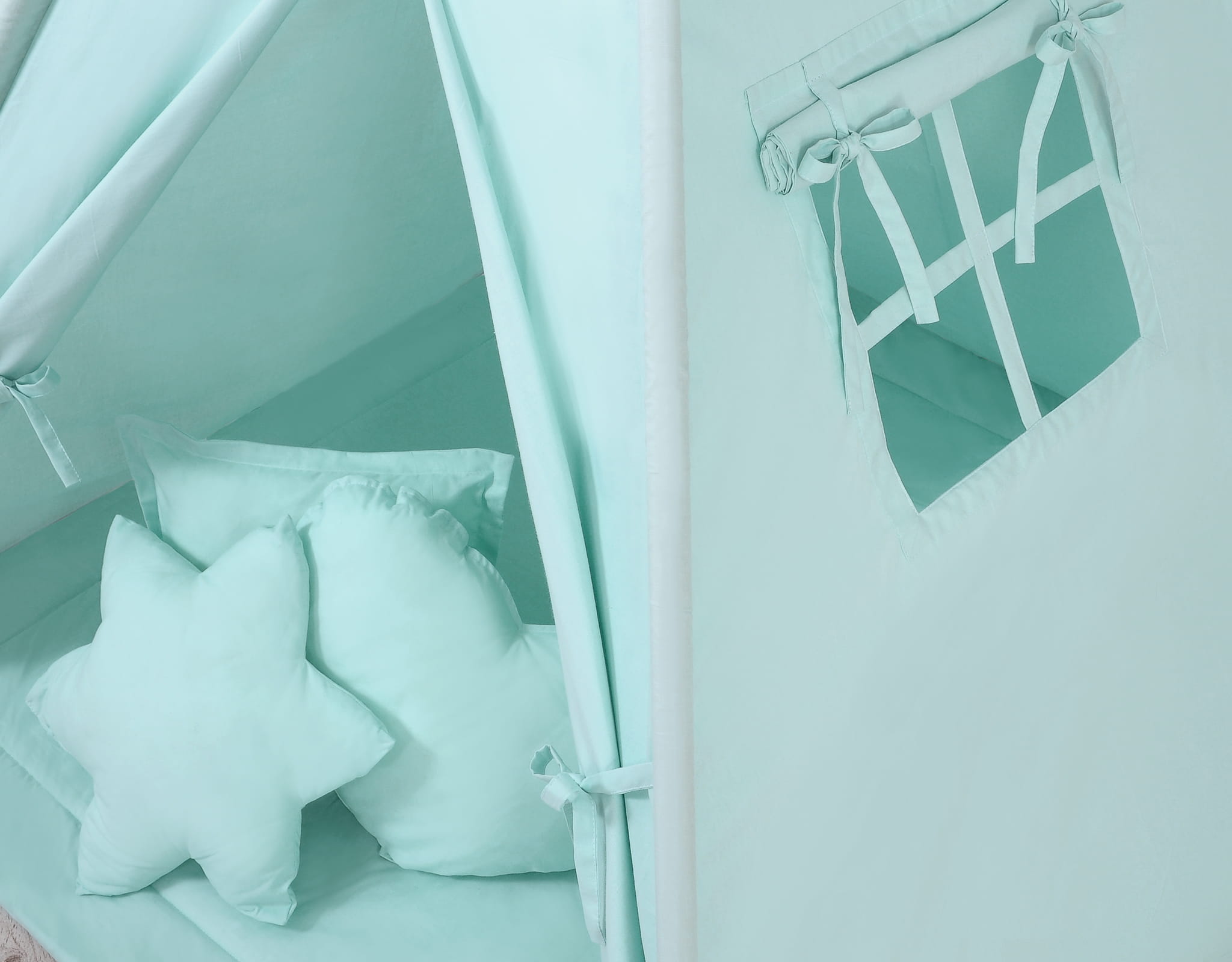 Namiot TIPI dla dzieci + mata + poduszki + zawieszki pióra - jasna mięta