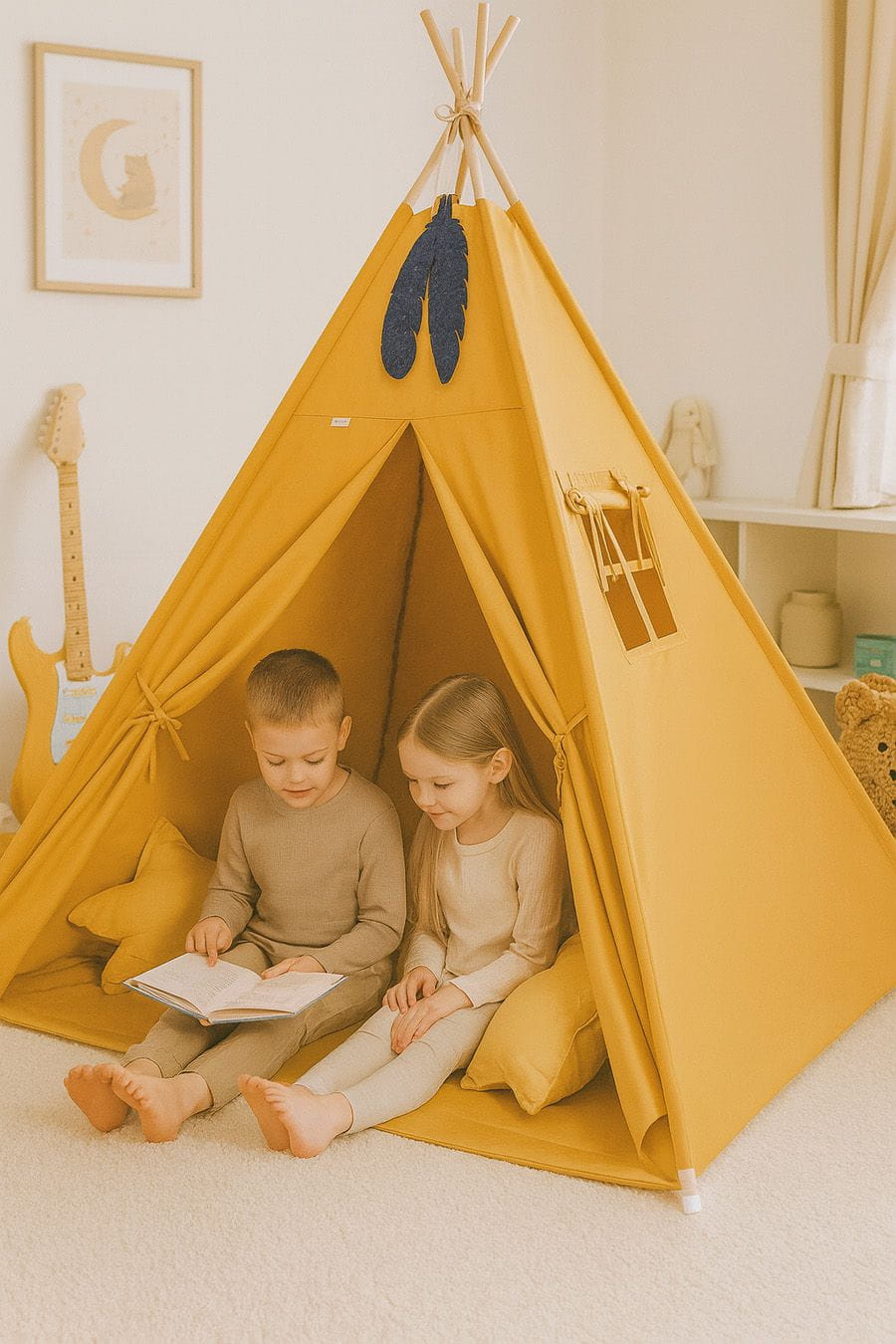Namiot TIPI dla dzieci + mata + poduszki + zawieszki pióra - musztardowy
