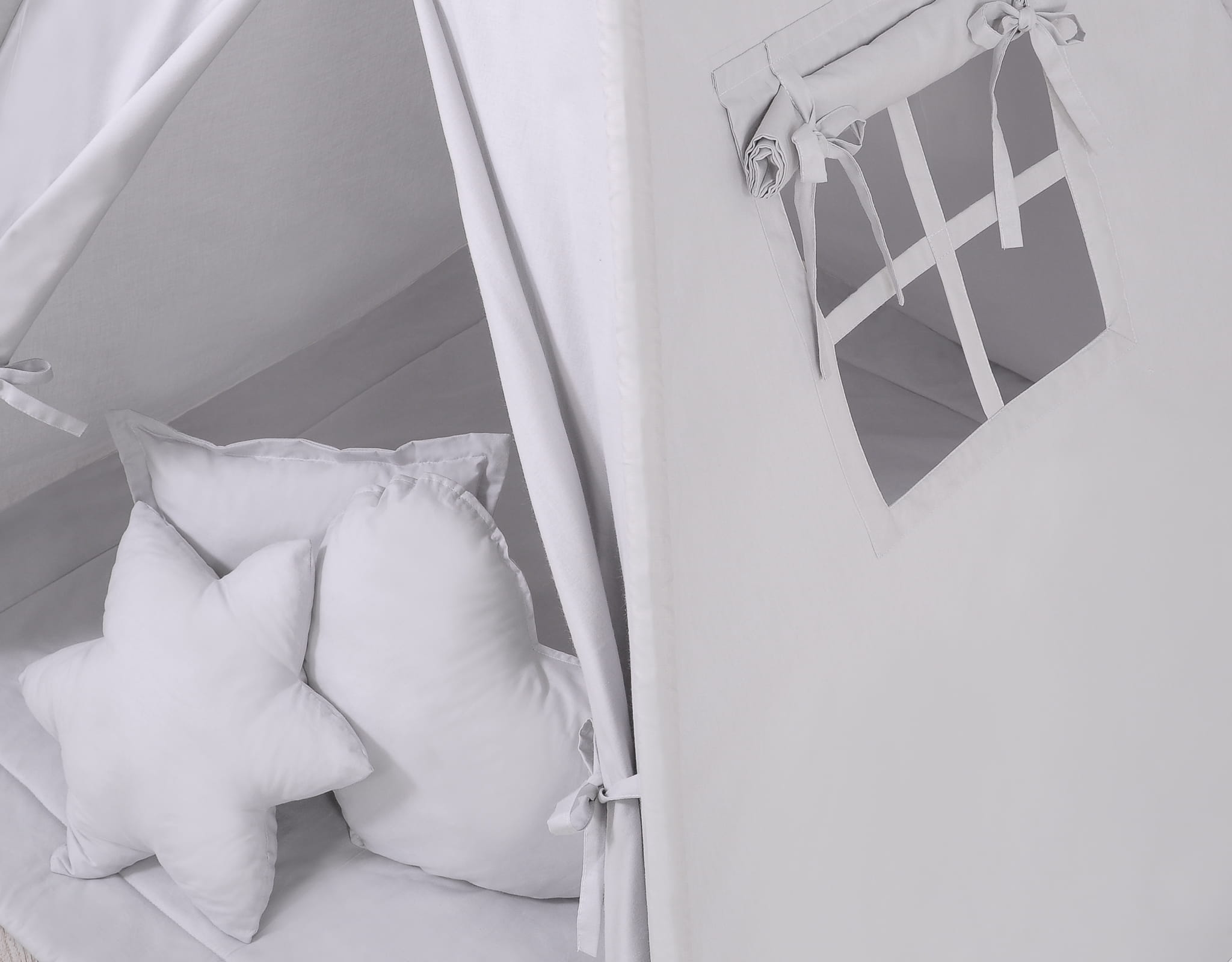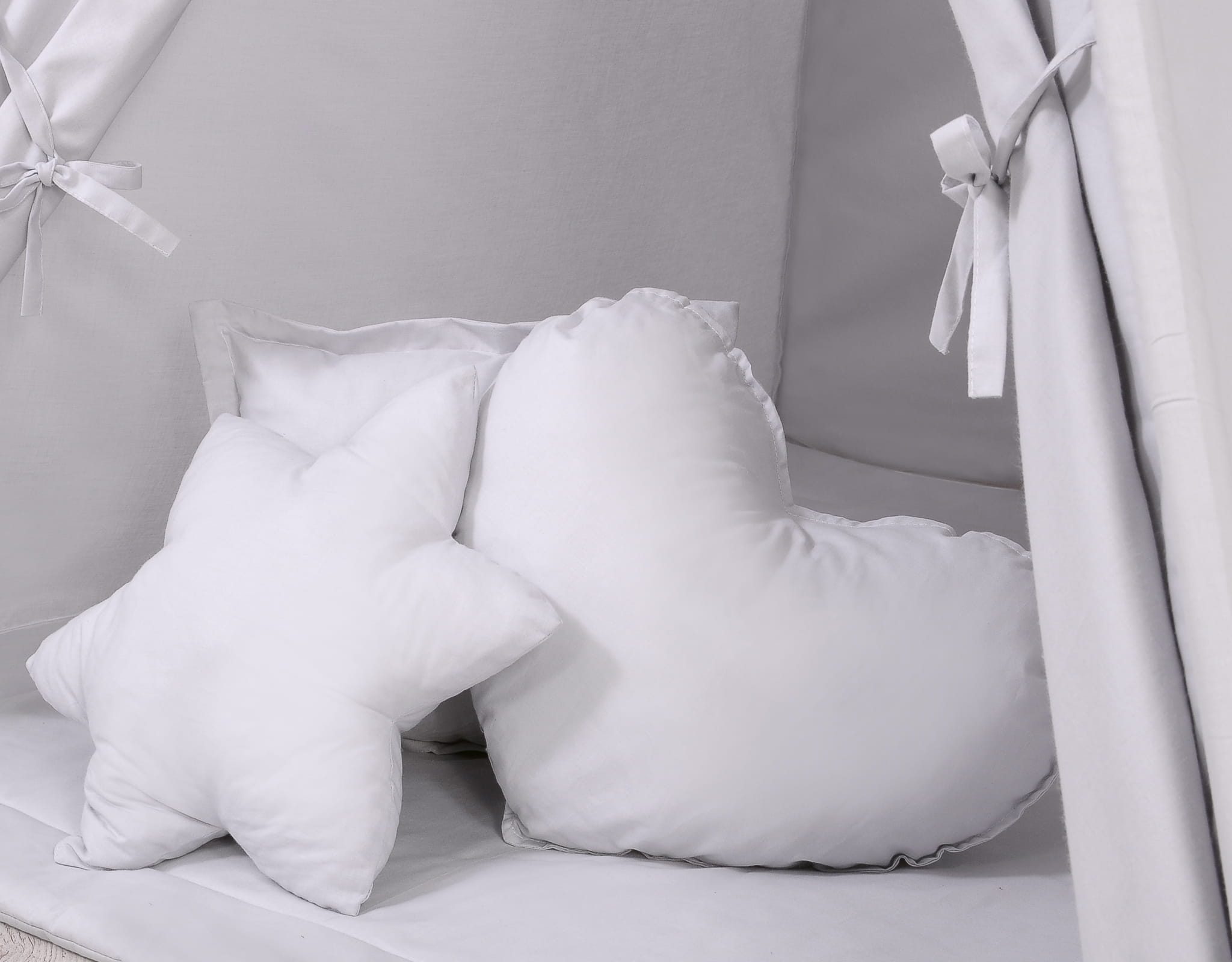 W komplecie zestaw 3 poduszek kolorystycznie dopasowanych do namiotu w trzech różnych kształtach: serduszko, gwiazdka i kwadratowy jasiek. Wykonane z najwyższej jakości atestowanej 100% bawełny, wypełnione specjalnym atestowanym włóknem - ECO FILLBALL.