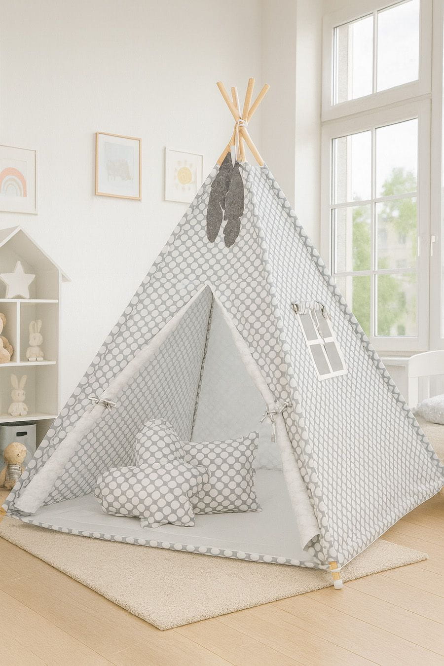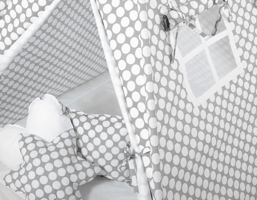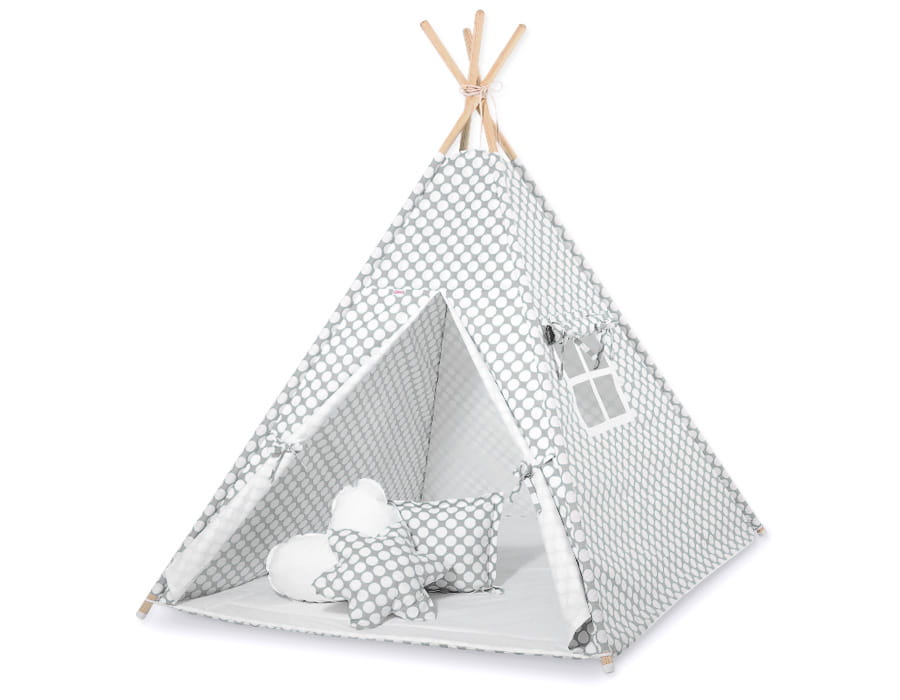 Namiot Tipi dla dzieci + zawieszki pióra - Kółeczka szare