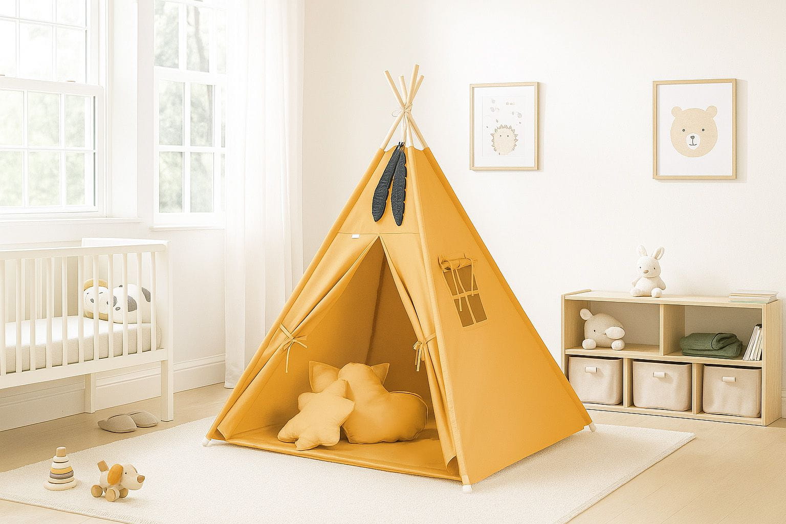 Namiot Tipi dla dzieci + zawieszki pióra - musztardowy