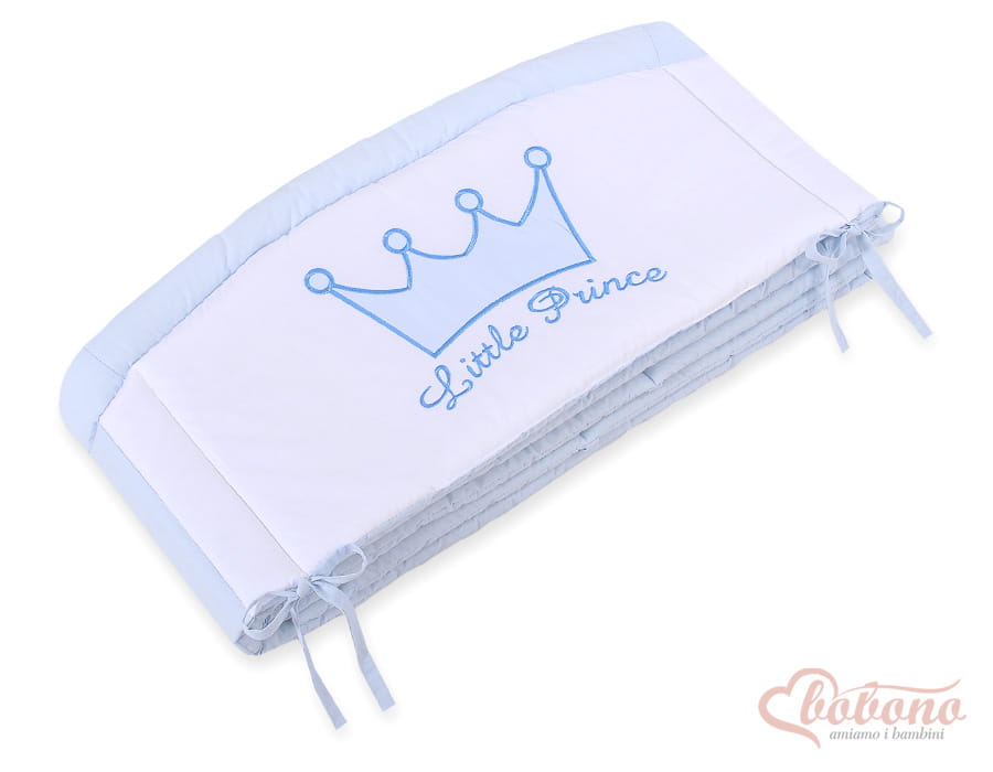 Uniwersalny ochraniacz XXL dwuczęściowy z haftem- jego wymiary to: długość ok. L-360cm, H- 35cm/ L-60cm, H-28cm. Specjalnie skonstruowany, składający się z dwóch elementów, z dodatkowymi przeszyciami, tak by idealnie pasował zarówno na łóżeczko 120x60 cm, jak i na większe łóżeczko 140x70 cm. Będzie, więc wam dłużej służył. Specjalnie obszyty, wzmocniony i pogrubiony górny brzeg, dla większej miękkości i większego bezpieczeństwa Maluszka w łóżeczku. Ochraniacz wypełniony jest specjalną antyalergiczną włókniną silikonową, grubą sprężystą i oddychającą. Wypełnienie to posiada atest Ökotex. Mocne troczki w kolorze pościeli ułatwią solidne przymocowanie ochraniacza do łóżeczka. Zagłówek ozdobiony pięknym haftem z koroną.