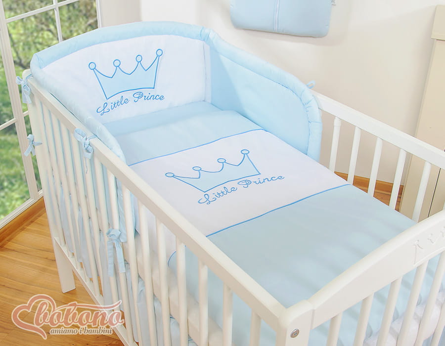 2. POSZEWKA NA KOŁDERKĘ 90x120 cm lub 135x100 cm. Wykonana z tkaniny 100% bawełnianej. Bezpiecznej dla delikatnej skóry dziecka. Posiadającej atest Okotex lub TUV. Poszewka zapinana na bezpieczny kryty zameczek. Na środku poszewki znajduje się śliczną aplikacja z koroną i wyhaftowanym napisem: "Little Prince" - dla chłopca lub "Little Princess" - dla dziewczynki.