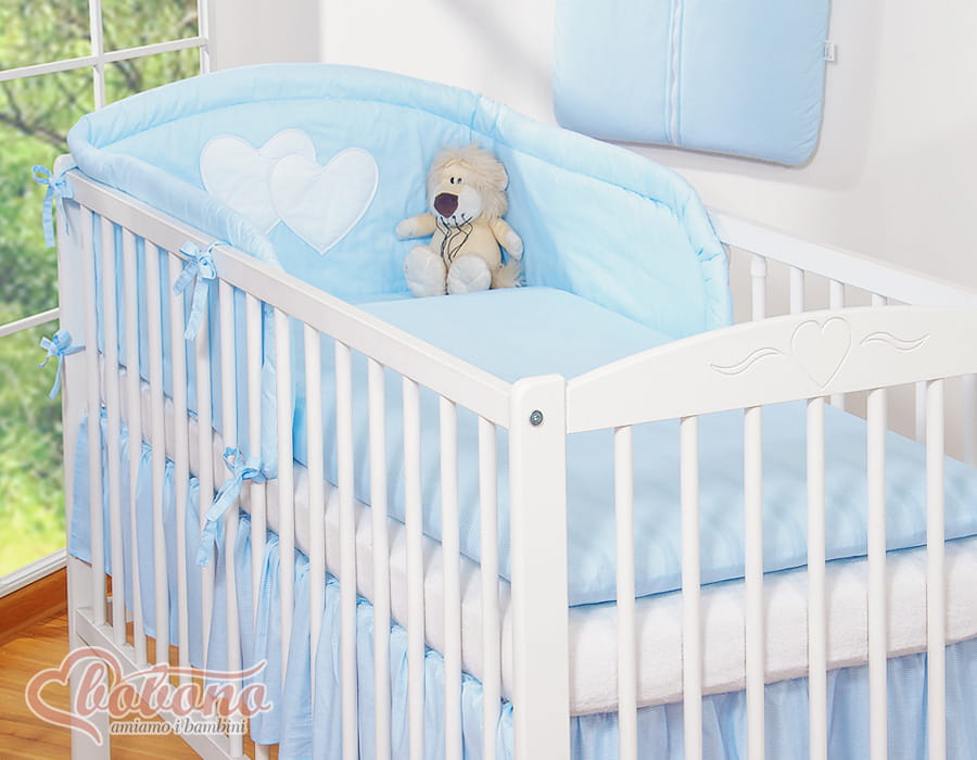 3.Ochraniacz uniwersalny zaokrąglony 35x188cm.Wysoki i sprężystyochraniacz doskonale amortyzuje i ochroni Twoje Maleństwo przed twardymi szczebelkami łóżeczka. Specjalnie skonstruowany i z dodatkowymi przeszyciami, tak by idealnie pasował zarówno na łóżeczko 120x60 cm, jak i na większe łóżeczko-tapczanik 140x70 cm, będzie więc wam dłużej służył. Zagłówek ozdobiony dużymi aplikacjami serduszek, pięknie obszytymi atłasową lamówką . Ochraniacz wypełniony jest grubą warstwą sprężystej antyalergicznej włókniny silikonowej, dzięki czemu ładnie układa się na łóżeczku. Włóknina posiada certyfikat Ökotex. Ochraniacz na łóżeczko wykonany jest z najwyższej jakości bawełny, która nie spiera się, "nie mechaci" i nie traci swoich właściwości nawet po wielu praniach. Bawełniane mocne troczki umożliwiają łatwe i solidne przymocowanie ochraniacza do łóżeczka dziecięcego.