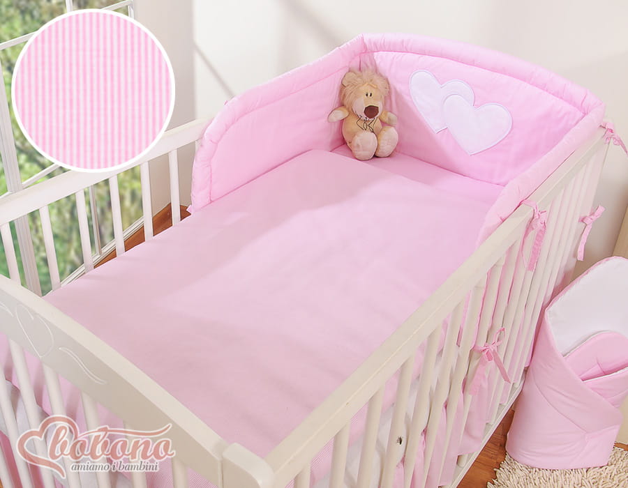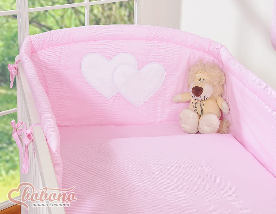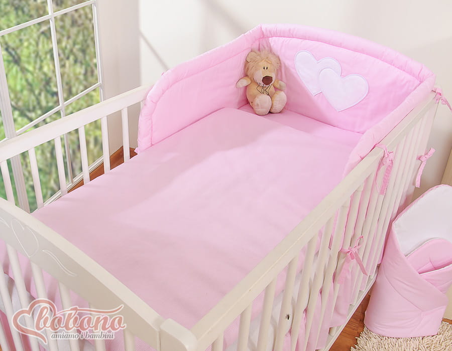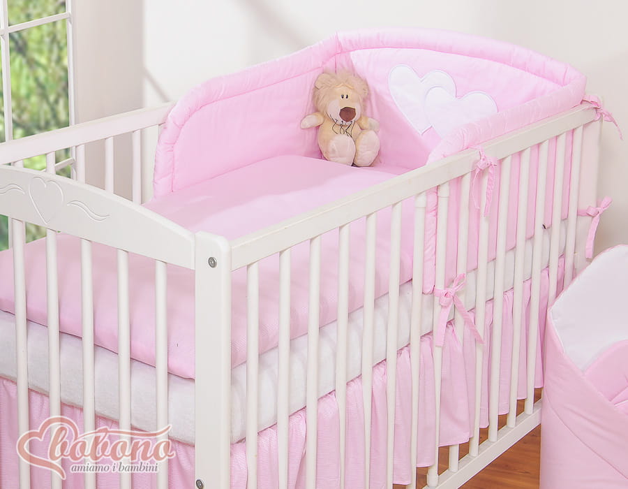 3.Ochraniacz uniwersalny zaokrąglony 35x188cm.Wysoki i sprężystyochraniacz doskonale amortyzuje i ochroni Twoje Maleństwo przed twardymi szczebelkami łóżeczka. Specjalnie skonstruowany i z dodatkowymi przeszyciami, tak by idealnie pasował zarówno na łóżeczko 120x60 cm, jak i na większe łóżeczko-tapczanik 140x70 cm, będzie więc wam dłużej służył. Zagłówek ozdobiony dużymi aplikacjami serduszek, pięknie obszytymi atłasową lamówką . Ochraniacz wypełniony jest grubą warstwą sprężystej antyalergicznej włókniny silikonowej, dzięki czemu ładnie układa się na łóżeczku. Włóknina posiada certyfikat Ökotex. Ochraniacz na łóżeczko wykonany jest z najwyższej jakości bawełny, która nie spiera się, "nie mechaci" i nie traci swoich właściwości nawet po wielu praniach. Bawełniane mocne troczki umożliwiają łatwe i solidne przymocowanie ochraniacza do łóżeczka dziecięcego.