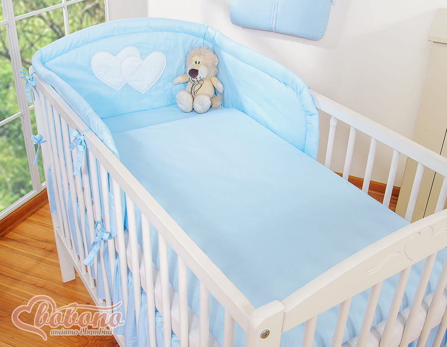 3.Ochraniacz uniwersalny zaokrąglony 35x188cm.Wysoki i sprężystyochraniacz doskonale amortyzuje i ochroni Twoje Maleństwo przed twardymi szczebelkami łóżeczka. Specjalnie skonstruowany i z dodatkowymi przeszyciami, tak by idealnie pasował zarówno na łóżeczko 120x60 cm, jak i na większe łóżeczko-tapczanik 140x70 cm, będzie więc wam dłużej służył. Zagłówek ozdobiony dużymi aplikacjami serduszek, pięknie obszytymi atłasową lamówką . Ochraniacz wypełniony jest grubą warstwą sprężystej antyalergicznej włókniny silikonowej, dzięki czemu ładnie układa się na łóżeczku. Włóknina posiada certyfikat Ökotex. Ochraniacz na łóżeczko wykonany jest z najwyższej jakości bawełny, która nie spiera się, "nie mechaci" i nie traci swoich właściwości nawet po wielu praniach. Bawełniane mocne troczki umożliwiają łatwe i solidne przymocowanie ochraniacza do łóżeczka dziecięcego.