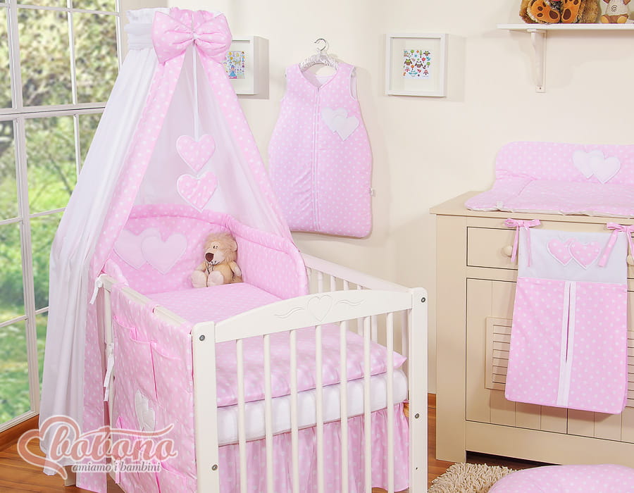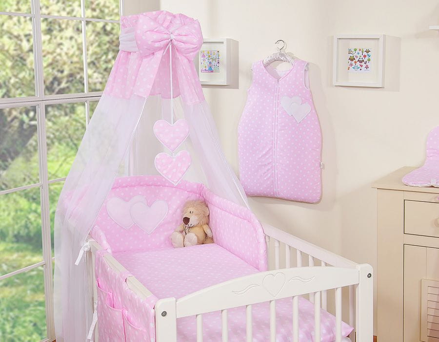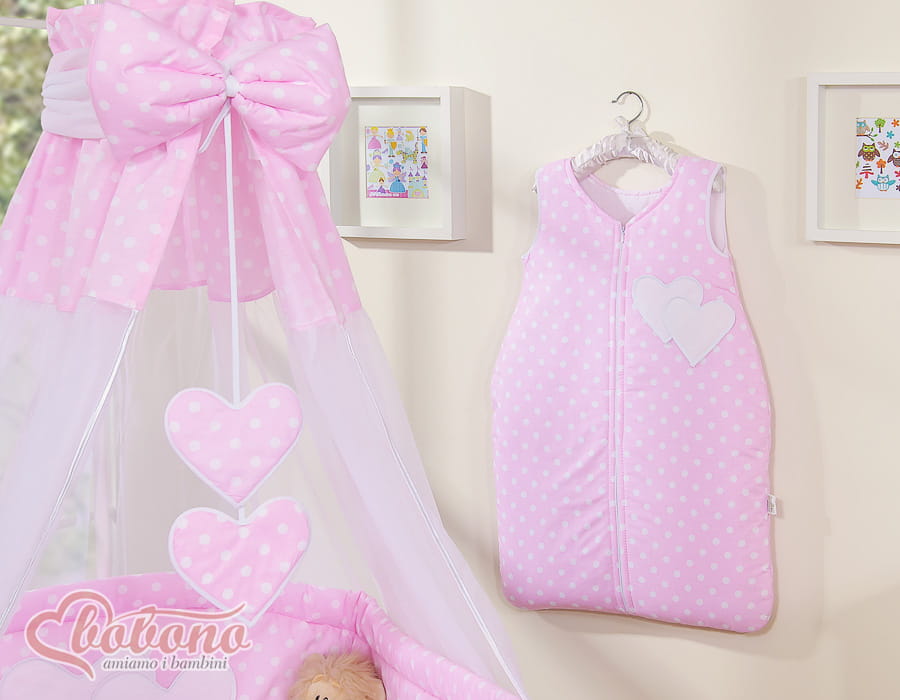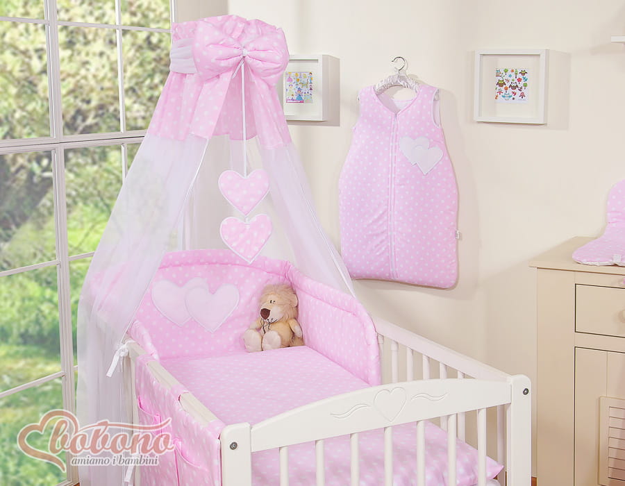 Pościel 5-cz 120x90 z baldachimem - Wiszące Serduszka białe grochy na różowym