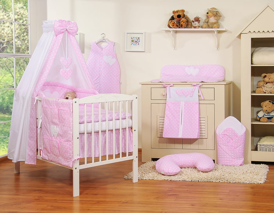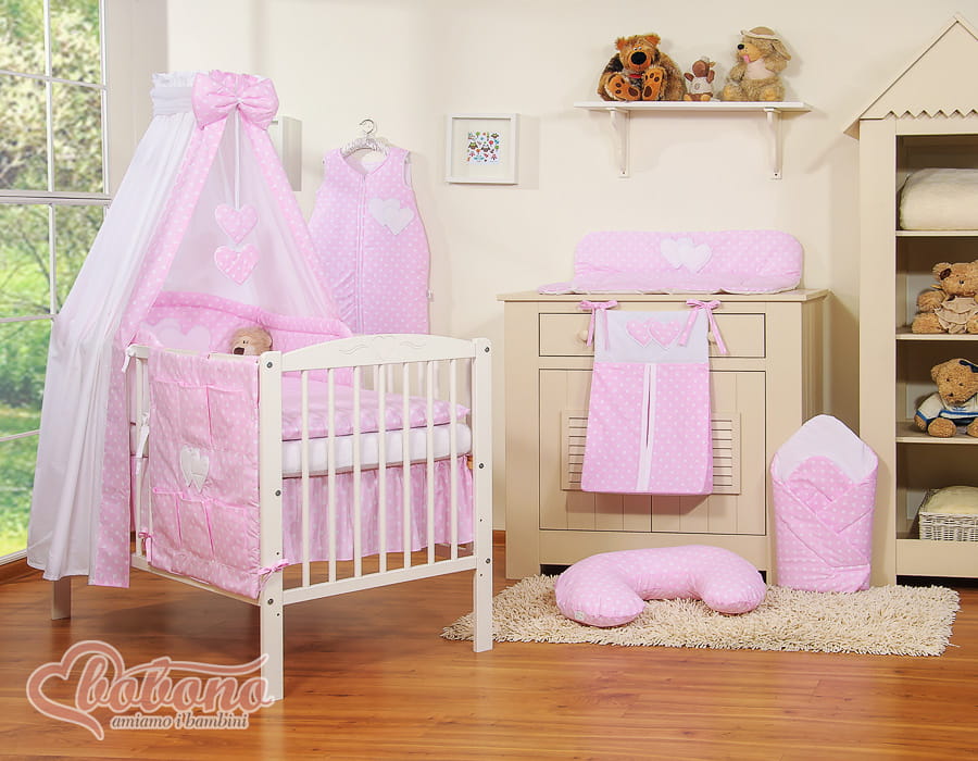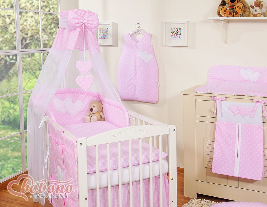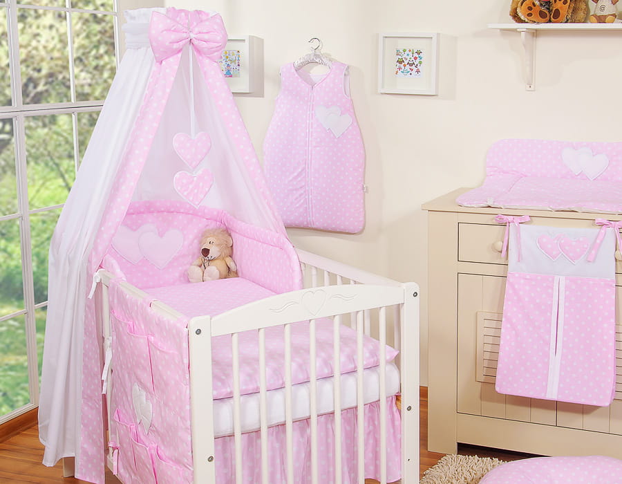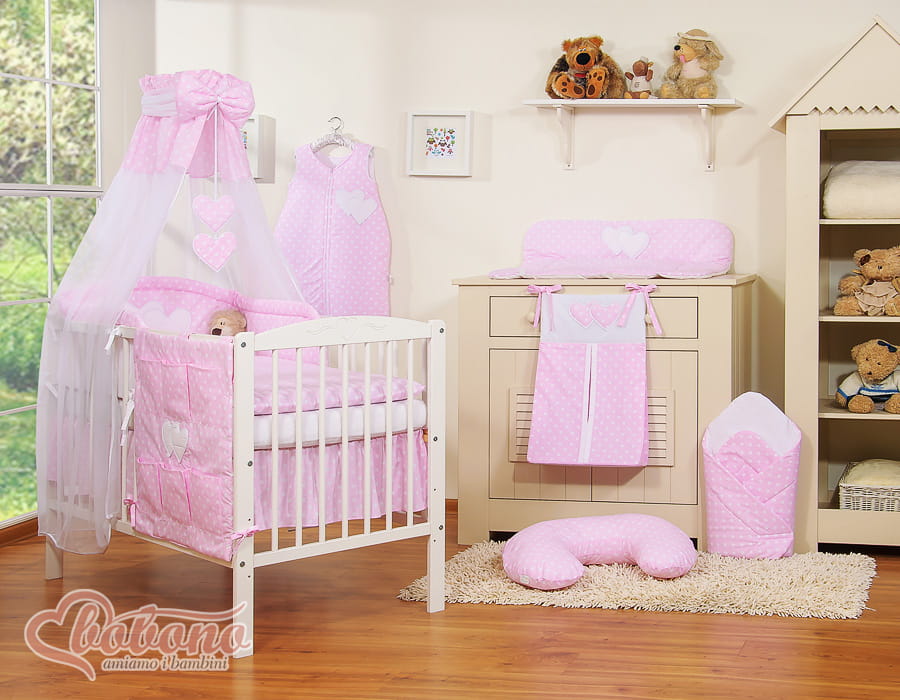 Niepowtarzalny zestaw pościeli 5- elementowej z przepiękną aplikacją serduszek. Nie podrażnia delikatnej skóry dziecka. Wysoki ochraniacz doskonale amortyzuje i ochroni Twoje Maleństwo przed twardymi szczebelkami łóżeczka. Wykonana z trwałej 100% atestowanej bawełny, bezpiecznej dla delikatnej skóry dziecka. W tej pościeli Wasze dziecko będzie spało spokojnie i bezpiecznie.