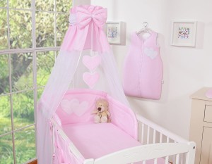 Pościel 5-cz 120x90 z baldachimem - Wiszące Serduszka paseczki różowe