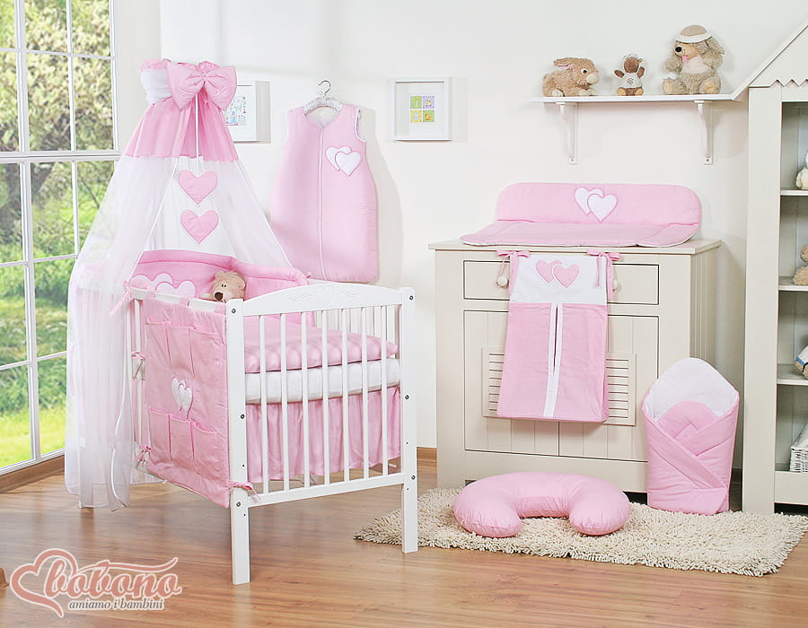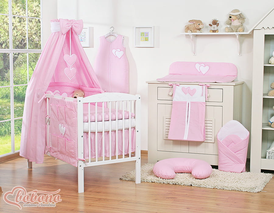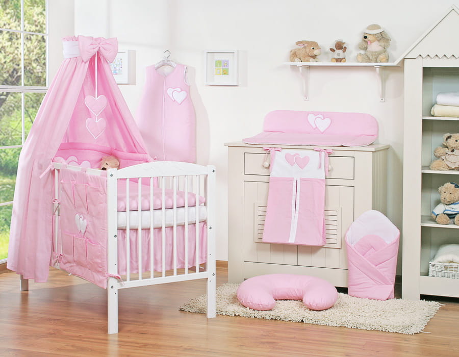 Niepowtarzalny zestaw pościeli 5- elementowej z przepiękną aplikacją serduszek. Nie podrażnia delikatnej skóry dziecka. Wysoki ochraniacz doskonale amortyzuje i ochroni Twoje Maleństwo przed twardymi szczebelkami łóżeczka. Wykonana z trwałej 100% atestowanej bawełny, bezpiecznej dla delikatnej skóry dziecka. W tej pościeli Wasze dziecko będzie spało spokojnie i bezpiecznie.