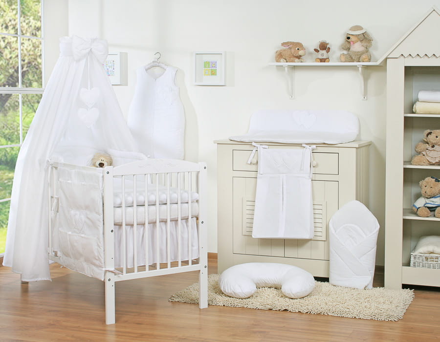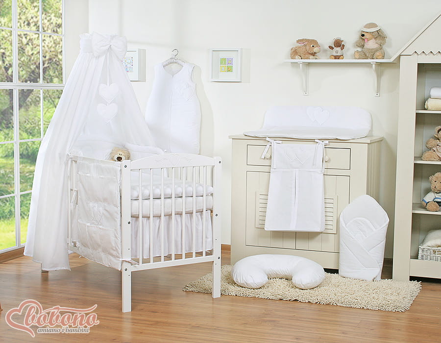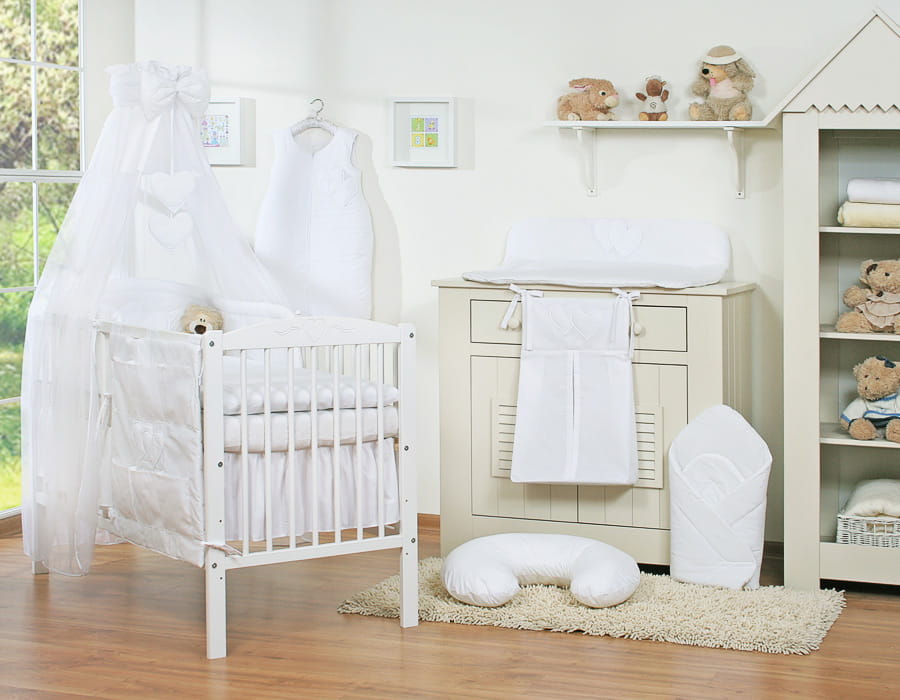 Niepowtarzalny zestaw pościeli 5- elementowej z przepiękną aplikacją serduszek. Nie podrażnia delikatnej skóry dziecka. Wysoki ochraniacz doskonale amortyzuje i ochroni Twoje Maleństwo przed twardymi szczebelkami łóżeczka. Wykonana z trwałej 100% atestowanej bawełny, bezpiecznej dla delikatnej skóry dziecka. W tej pościeli Wasze dziecko będzie spało spokojnie i bezpiecznie.