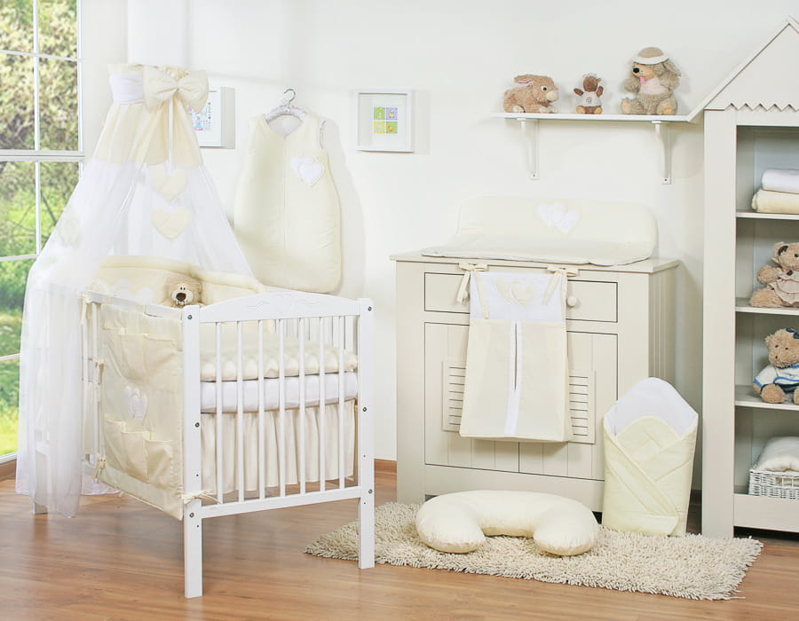 Niepowtarzalny zestaw pościeli 5- elementowej z przepiękną aplikacją serduszek. Nie podrażnia delikatnej skóry dziecka. Wysoki ochraniacz doskonale amortyzuje i ochroni Twoje Maleństwo przed twardymi szczebelkami łóżeczka. Wykonana z trwałej 100% atestowanej bawełny, bezpiecznej dla delikatnej skóry dziecka. W tej pościeli Wasze dziecko będzie spało spokojnie i bezpiecznie.