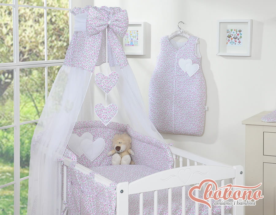Niepowtarzalny zestaw pościeli 5- elementowej z przepiękną aplikacją serduszek. Nie podrażnia delikatnej skóry dziecka. Wysoki ochraniacz doskonale amortyzuje i ochroni Twoje Maleństwo przed twardymi szczebelkami łóżeczka. Wykonana z trwałej 100% atestowanej bawełny, bezpiecznej dla delikatnej skóry dziecka. W tej pościeli Wasze dziecko będzie spało spokojnie i bezpiecznie.