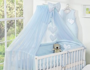 Pościel 5-cz z moskitierą- Wiszące Serduszka niebieskie