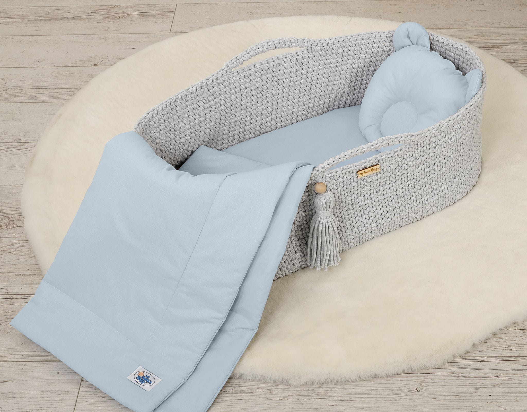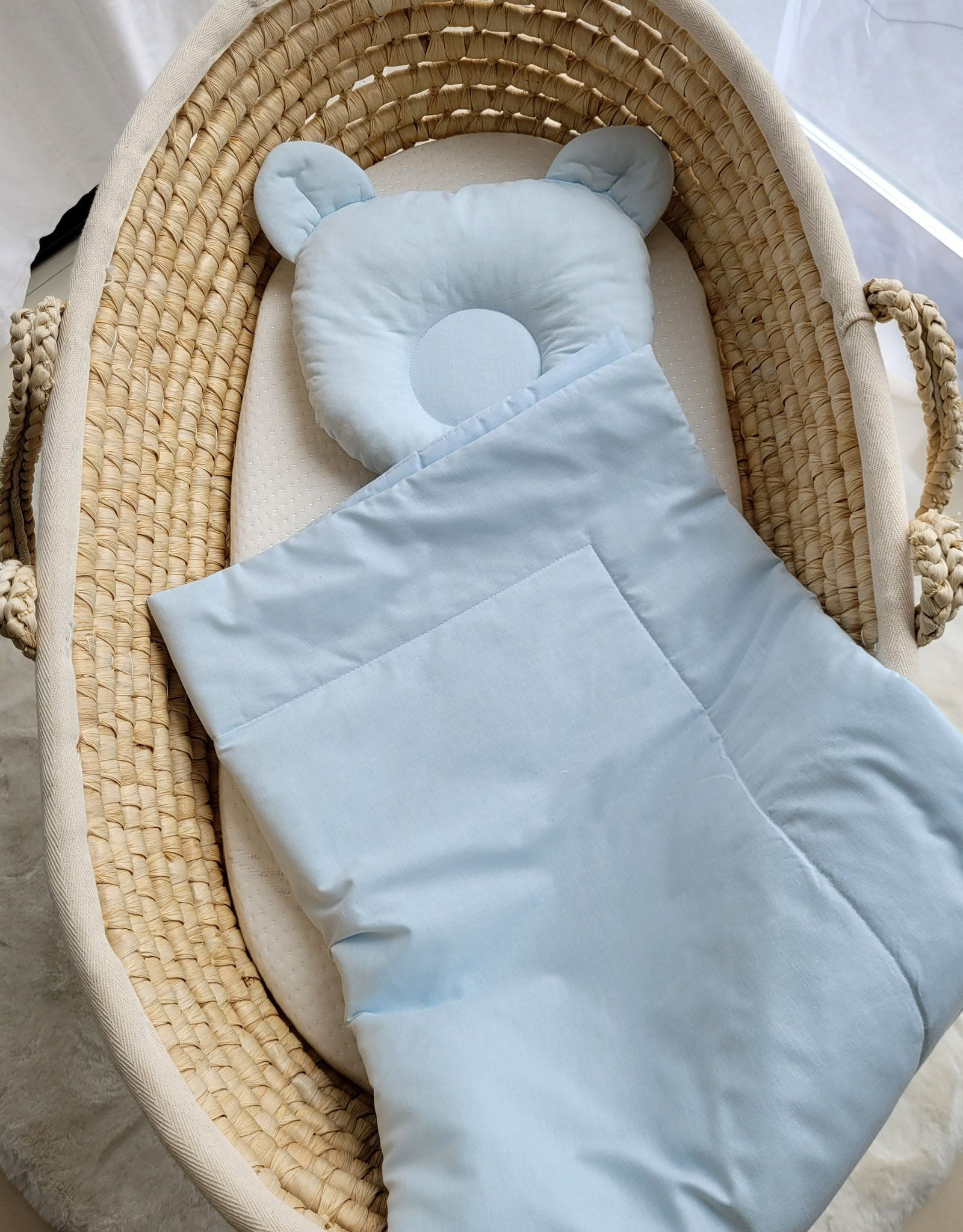 Pościel niemowlęca do gondoli wózka, kosza Mojżesza lub łóżeczka. Wykonana z trwałej 100% atestowanej bawełny. Jest miła i przyjemna w dotyku. Nie podrażnia delikatnej skóry dziecka.