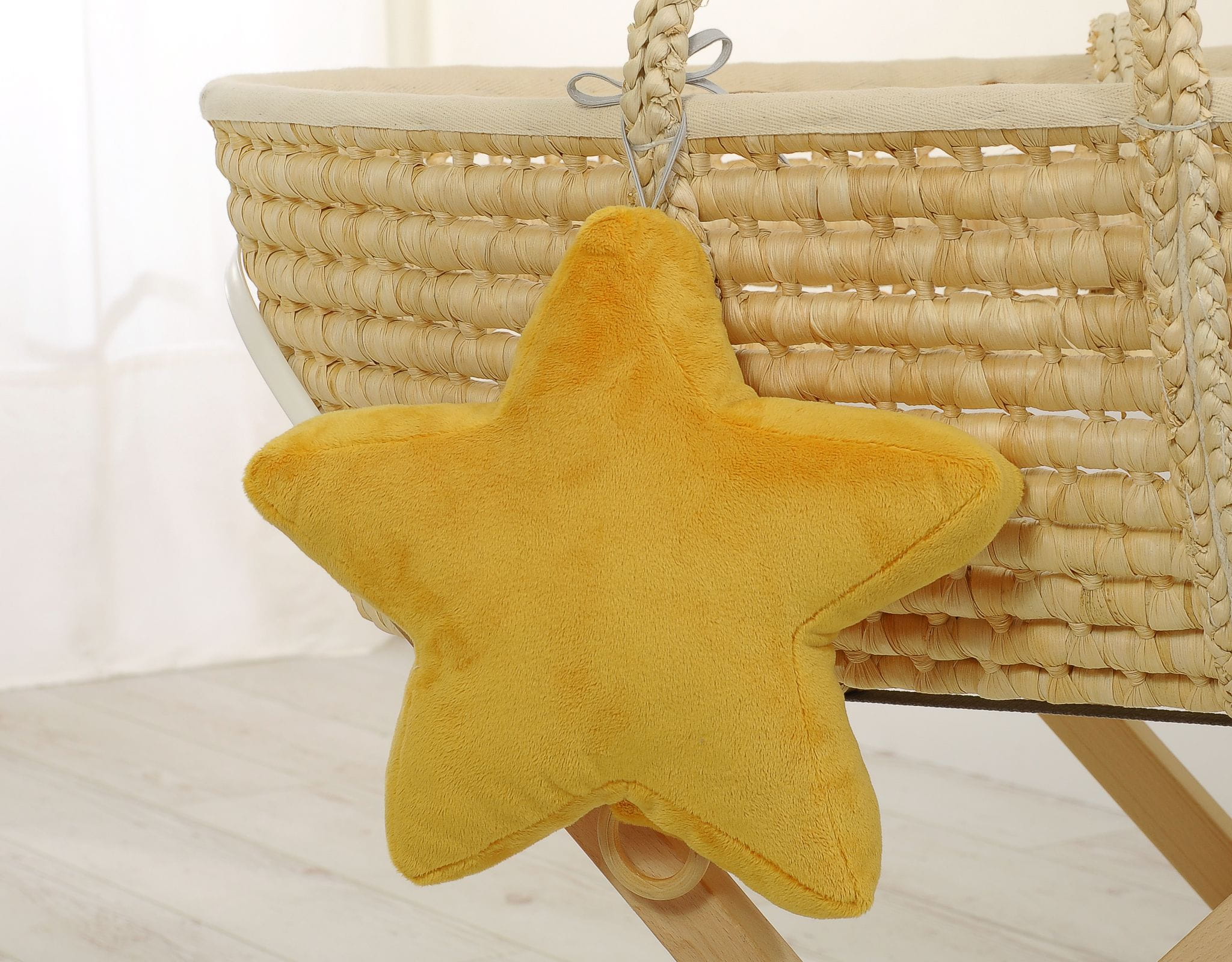 Pozytywka dla niemowląt - miękka gwiazdka. Piękna pozytywka z delikatną melodią ułatwi usypianie niemowlaka, będzie też piękną dekoracją pokoju dziecięcego. Wykonana z miękkiego delikatnego gładkiego minky. Wypełnienie to antyalergiczne włókna - kulki silikonowe bez wybielaczy optycznych. Mechanizm pozytywki umocowany do bukowego drewnianego kółeczka.