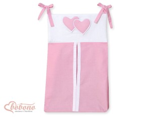 Oryginalny przybornik ułatwiający przechowywanie pieluszek "pod ręką". Przybornik bardzo łatwo przymocować do łóżeczka lub komody. Rozcięcie na przodzie pozwala na łatwe wkładanie lub wyciąganie pampersów. Przód przybornika ozdobiony jest dużymi aplikacjami serduszek. Dno usztywniane.