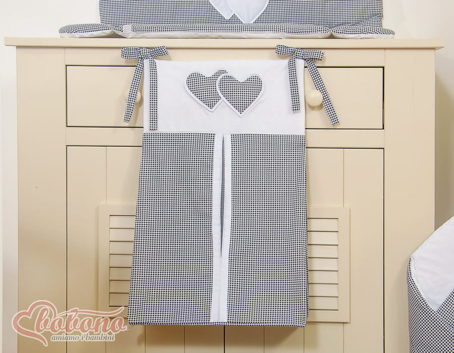 Oryginalny przybornik ułatwiający przechowywanie pieluszek "pod ręką". Przybornik bardzo łatwo przymocować do łóżeczka lub komody. Rozcięcie na przodzie pozwala na łatwe wkładanie lub wyciąganie pampersów. Przód przybornika ozdobiony jest dużymi aplikacjami serduszek. Dno usztywniane.