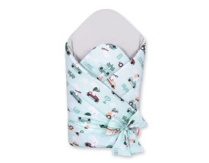 Rożek dla niemowląt z wiązaniem 2w1 usztywniany i miękki - zające w autkach miętowe