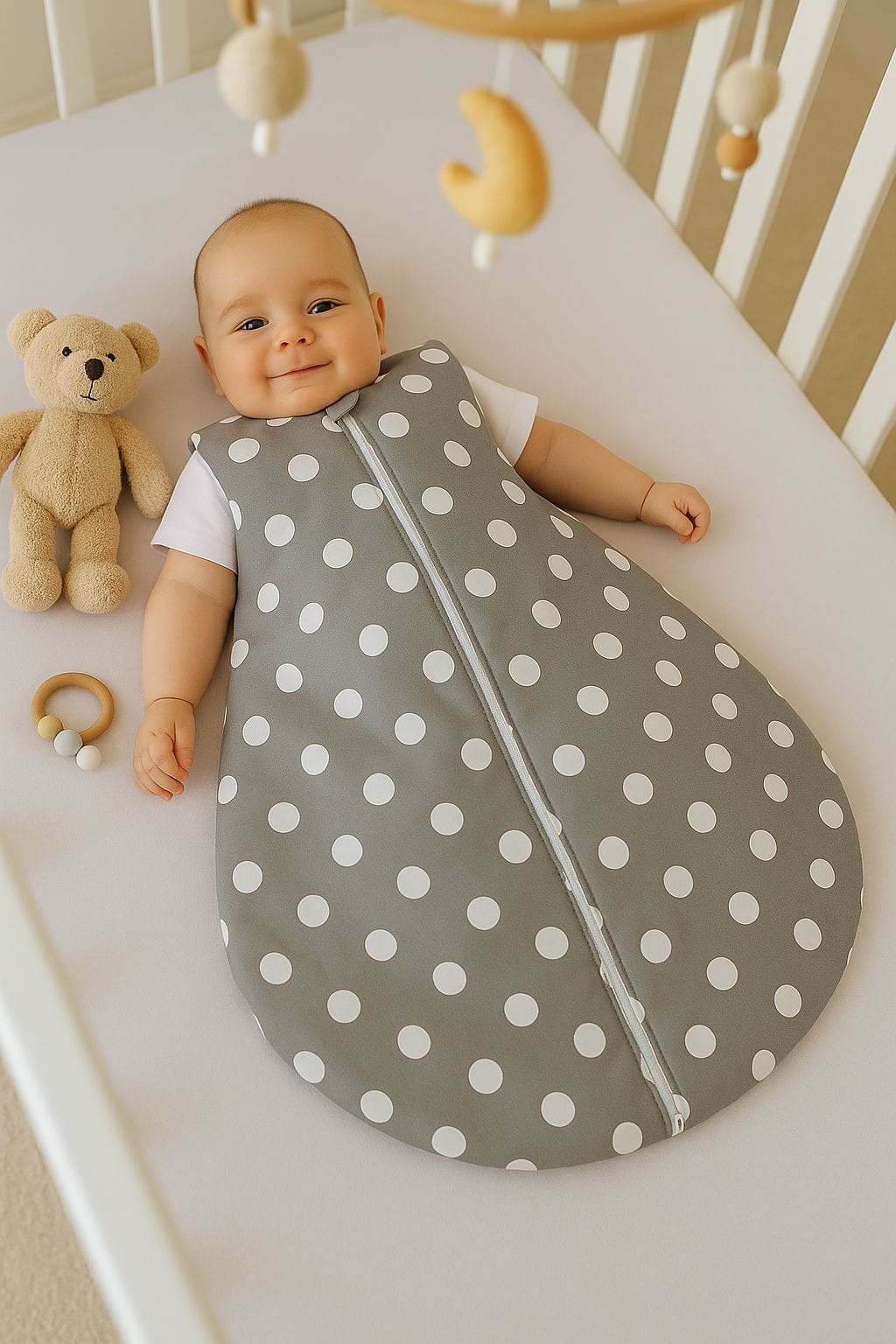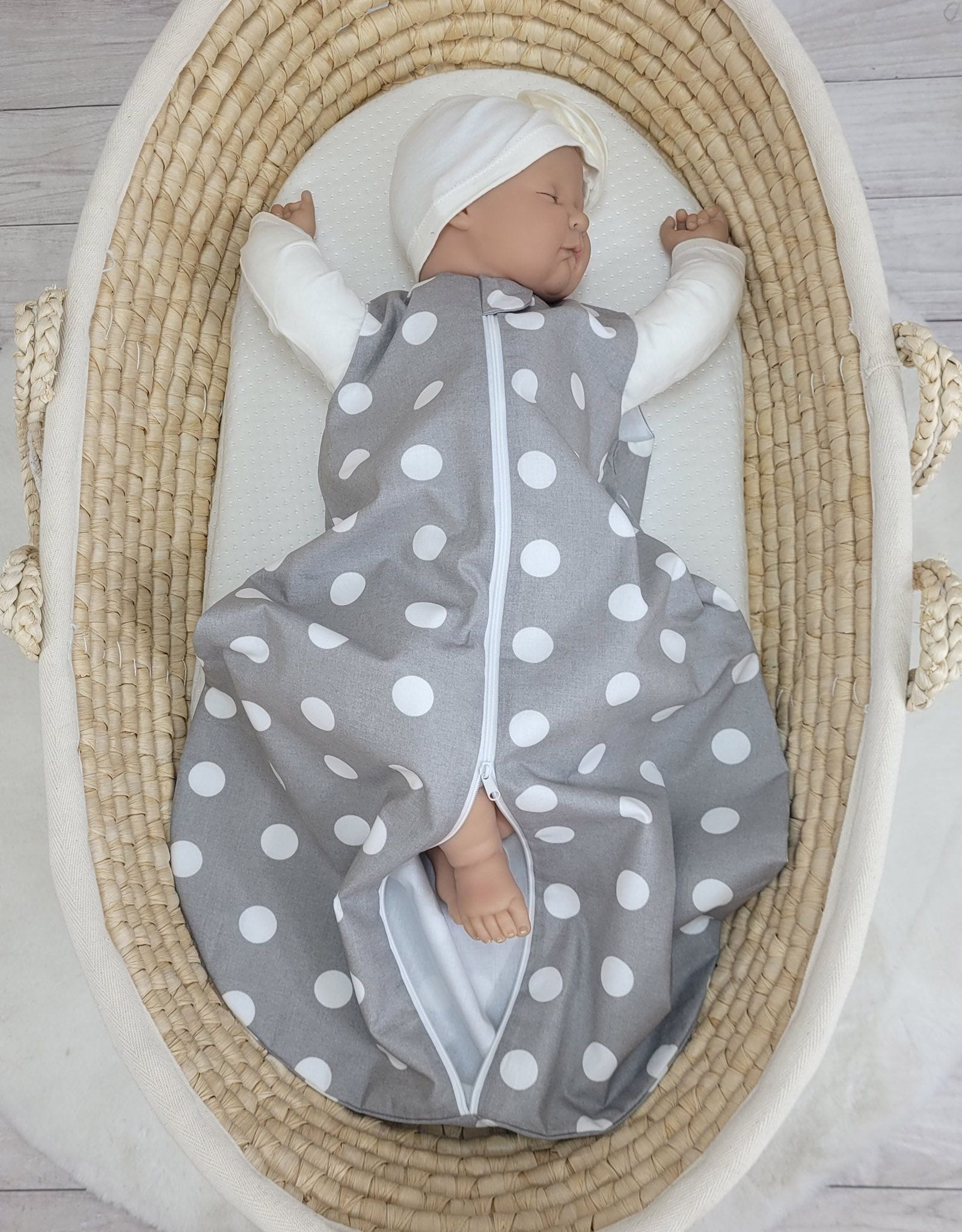Śpiworek dla dzieci bawełniany zaokrąglony S 0-6 mcy letni TOG 1.0 - grochy na szarym