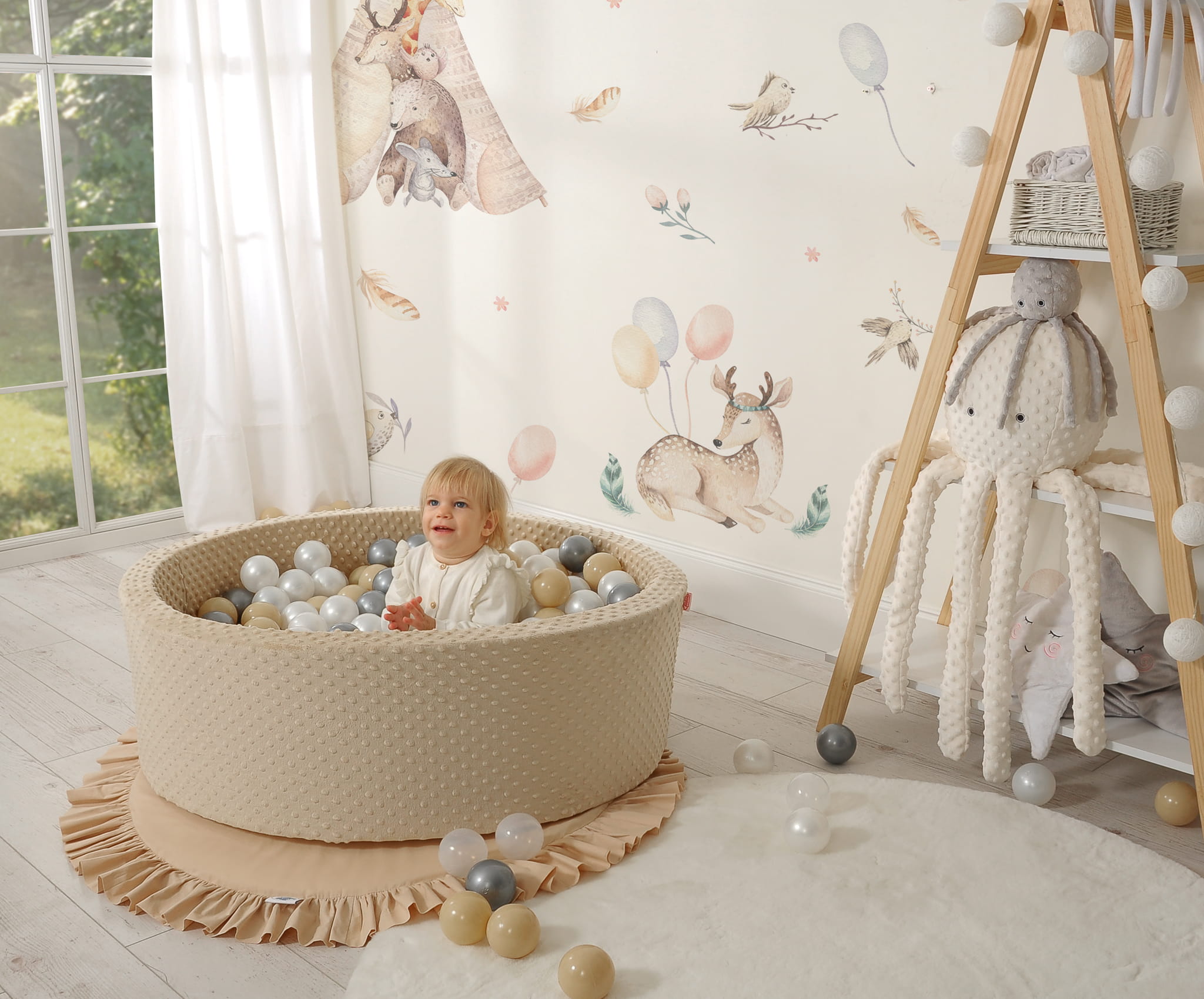 Basen jest okrągły o średnicy 90cm. Wysokość boku 30cm. Wykonany w całości z miękkiej pianki. Pokrowiec wykonany z mięciutkiego minky w kropki. Zapinany na zamki błyskawiczne, dzięki czemu łatwo zdjąć go do prania.
