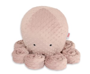 Wykonana jest z miłego w dotyku, miękkiego i delikatnego minky w wypukłe kropki. Oczy ośmiornicy starannie wyhaftowane. Wypełnienie przytulanki to specjalnie atestowane włókno ECOFILLBALL. Są to cienkie i miękkie włókna uformowane w drobne kuleczki z dodatkowymi kanalikami powietrza. Dzięki specjalnej technologii i produkcji kuleczki te są puszyste i sprężyste, a przy tym w dotyku są miękkie i delikatne jak puch, zapewniają odpowiednią cyrkulację powietrza.