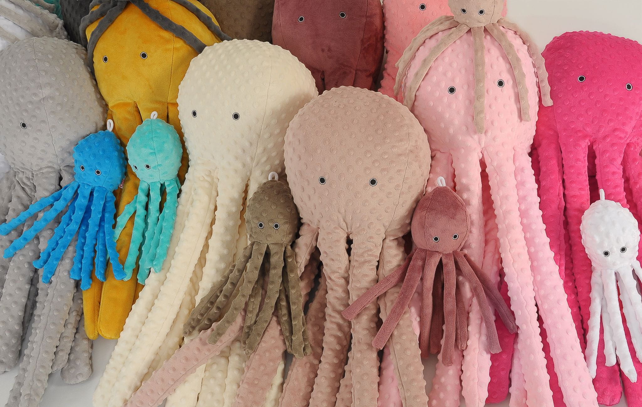 Zabawna wielka przytulanka dla dzieci. Idealna do spania i przytulania dla każdego dużego i małego. Ramiona ośmiornicy są długie i efektowne. Ośmiornica może służyć jako poduszka, oparcie i siedzisko. Wielka ośmiornica jest też ciekawą ozdobą pokoju dziecięcego. Miękkość przytulanki zachęca do miętoszenia i przytulania. Ośmiornica uszyta jest z minky w kropki. Wypukłe kropeczki wyglądają na ośmiornicy świetnie!
