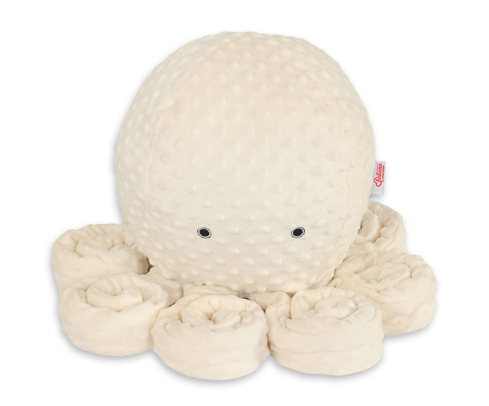 Wykonana jest z miłego w dotyku, miękkiego i delikatnego minky w wypukłe kropki. Oczy ośmiornicy starannie wyhaftowane. Wypełnienie przytulanki to specjalnie atestowane włókno ECOFILLBALL. Są to cienkie i miękkie włókna uformowane w drobne kuleczki z dodatkowymi kanalikami powietrza. Dzięki specjalnej technologii i produkcji kuleczki te są puszyste i sprężyste, a przy tym w dotyku są miękkie i delikatne jak puch, zapewniają odpowiednią cyrkulację powietrza.