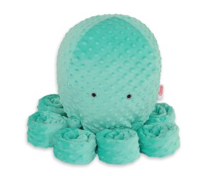 Wykonana jest z miłego w dotyku, miękkiego i delikatnego minky w wypukłe kropki. Oczy ośmiornicy starannie wyhaftowane. Wypełnienie przytulanki to specjalnie atestowane włókno ECOFILLBALL. Są to cienkie i miękkie włókna uformowane w drobne kuleczki z dodatkowymi kanalikami powietrza. Dzięki specjalnej technologii i produkcji kuleczki te są puszyste i sprężyste, a przy tym w dotyku są miękkie i delikatne jak puch, zapewniają odpowiednią cyrkulację powietrza.