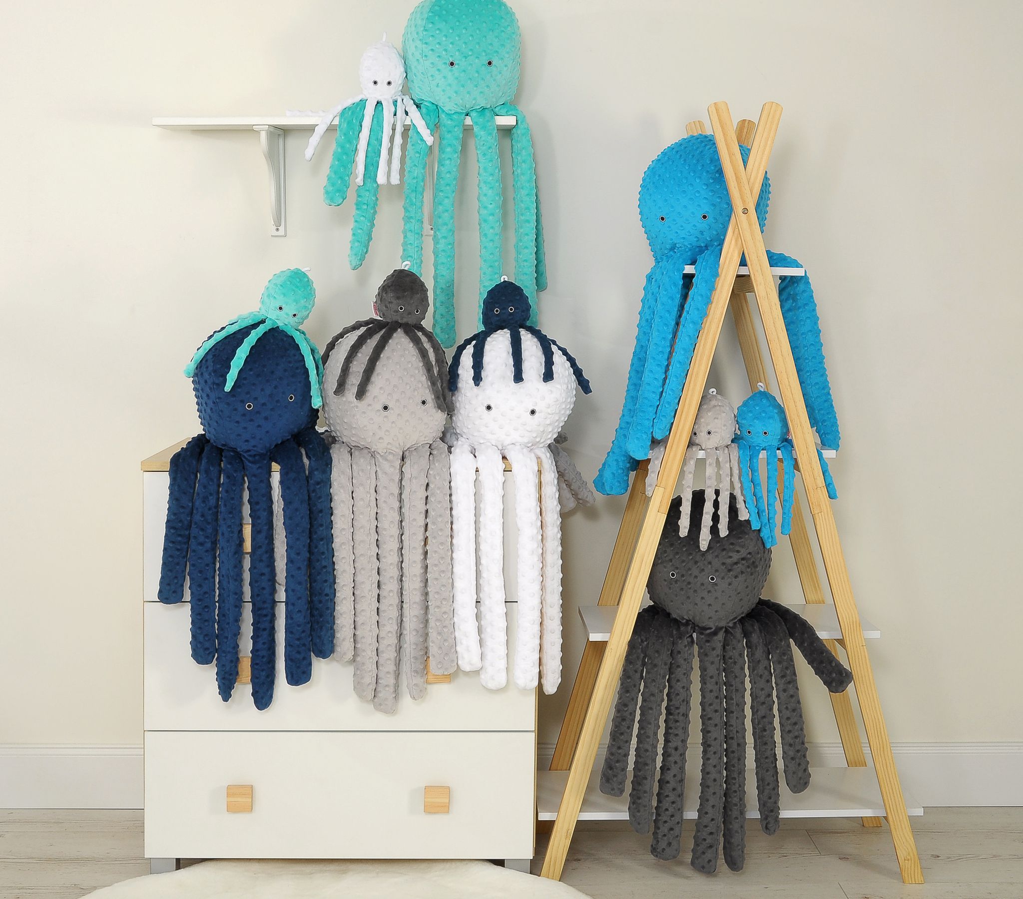 Zabawna wielka przytulanka dla dzieci. Idealna do spania i przytulania dla każdego dużego i małego. Ramiona ośmiornicy są długie i efektowne. Ośmiornica może służyć jako poduszka, oparcie i siedzisko. Wielka ośmiornica jest też ciekawą ozdobą pokoju dziecięcego. Miękkość przytulanki zachęca do miętoszenia i przytulania. Ośmiornica uszyta jest z minky w kropki. Wypukłe kropeczki wyglądają na ośmiornicy świetnie!