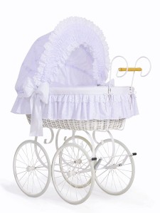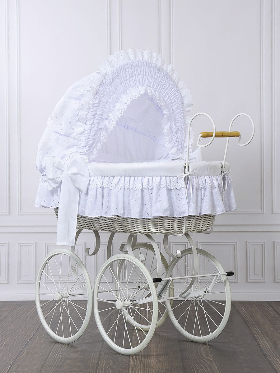 Wiklinowy kosz Mojżesza Retro ze składaną budką Charlote - biały + biała pościel z koronką