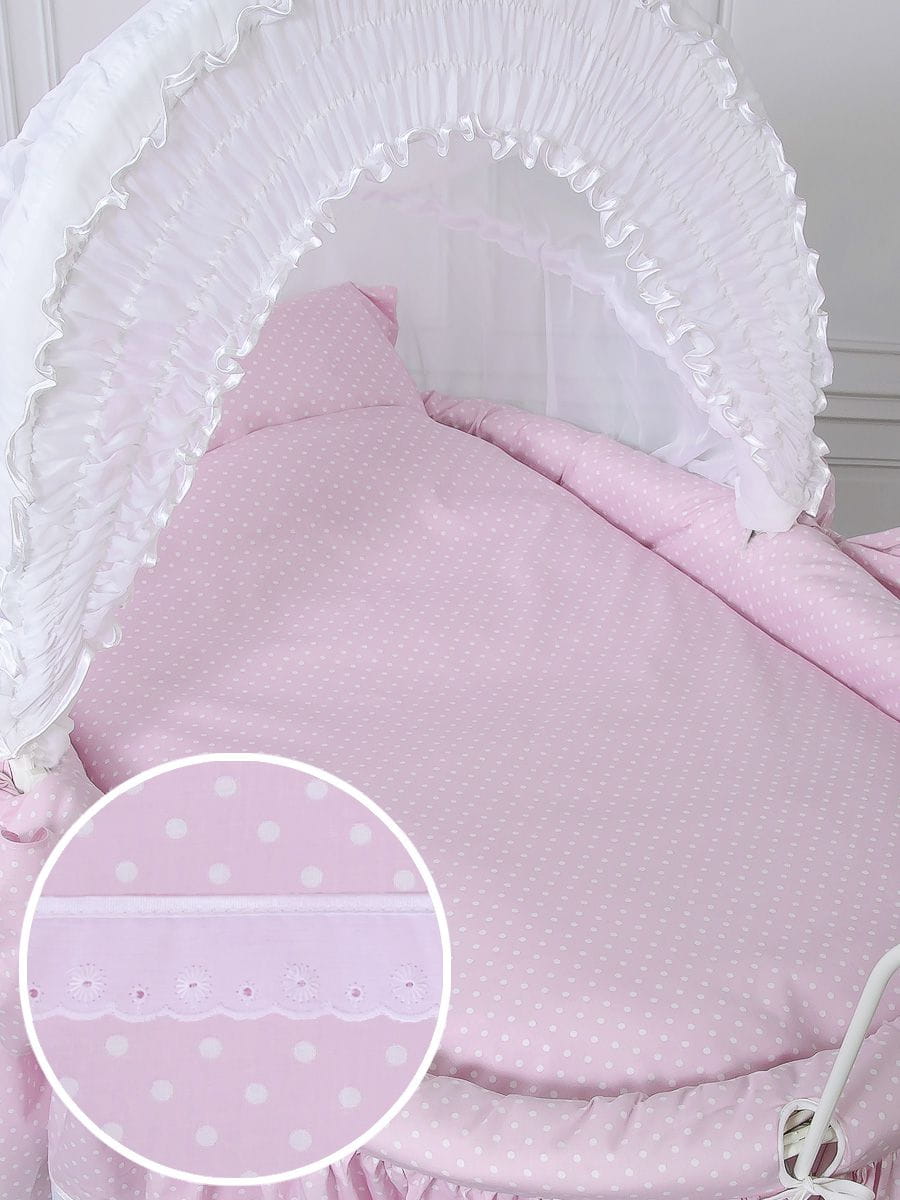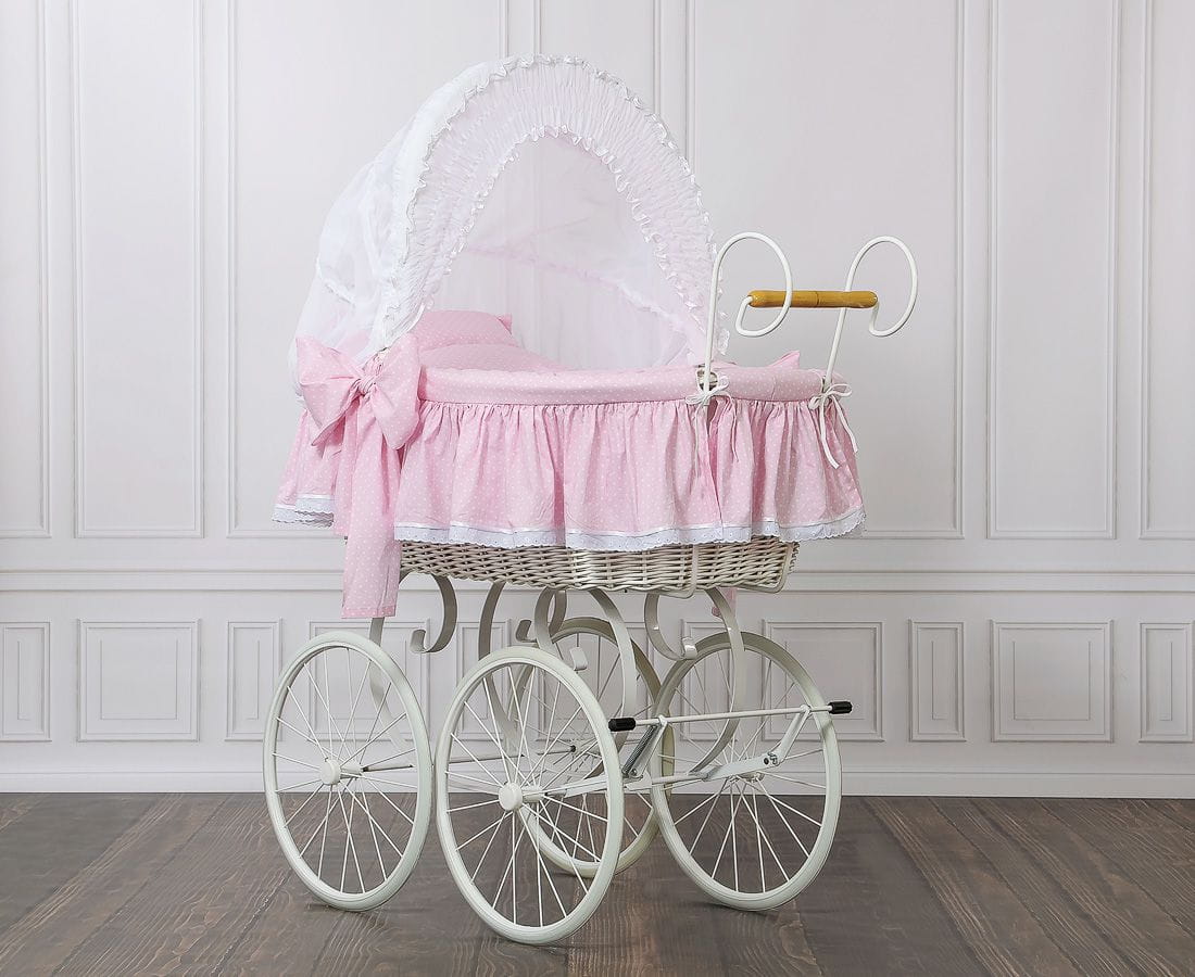 Wiklinowy kosz Mojżesza Retro ze składaną budką Christine - biały + różowa pościel z koronką