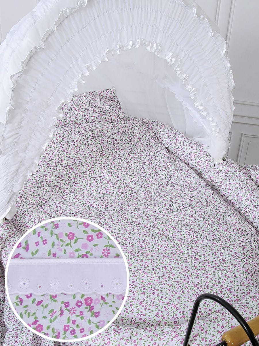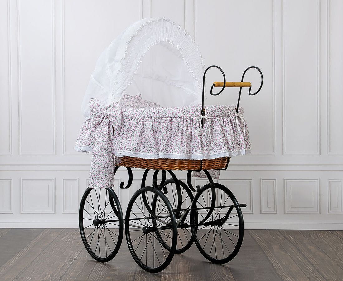 Wiklinowy kosz Mojżesza Retro ze składaną budką Jasmine - naturalny + różowa pościel z koronką