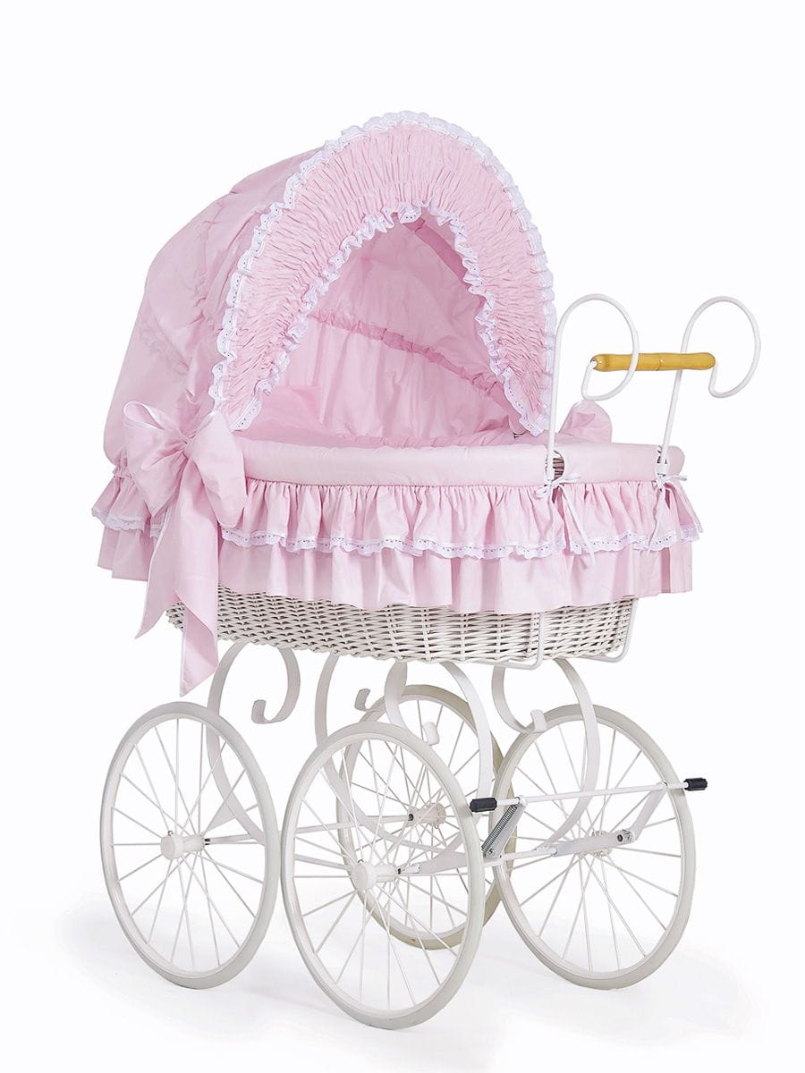 Wiklinowy kosz Mojżesza Retro ze składaną budką Victoria - biały + różowa pościel z koronką