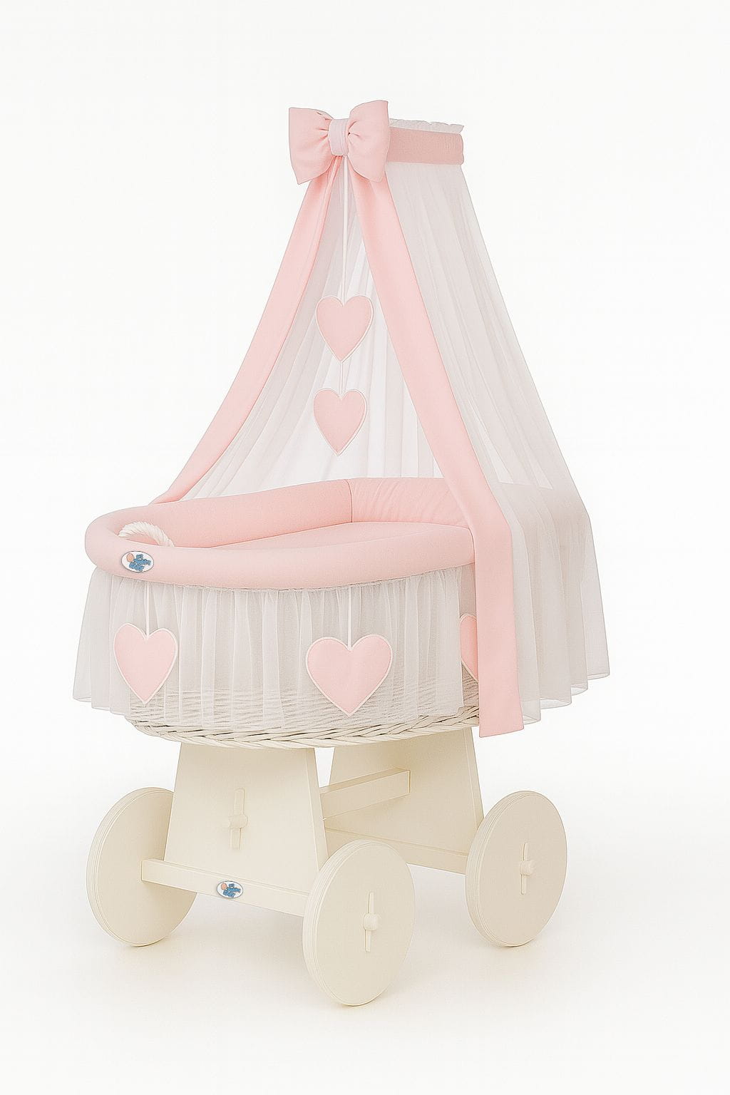 - Obszycie 3-warstwowe kosza z miękką włókniną, wykończone wokół kosza falbaną z sercami, zdejmowane do prania