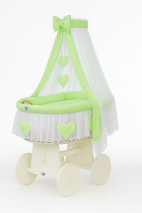Wiklinowy kosz Mojżesza z baldachimem Amelia - biały + zielona pościel