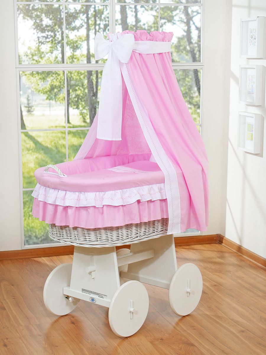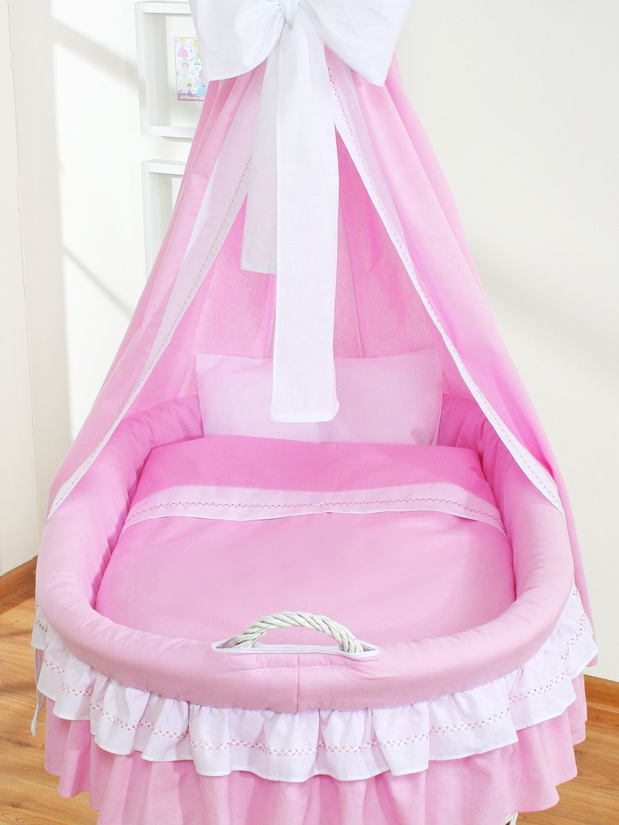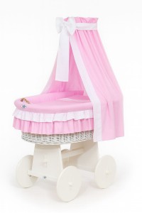 Wiklinowy kosz Mojżesza z baldachimem Bellamy - biały + różowa pościel