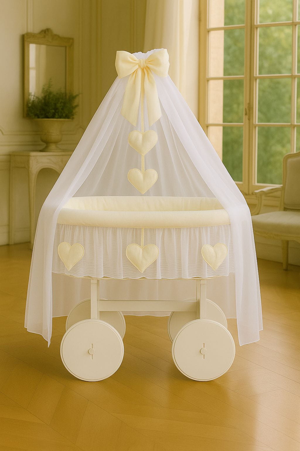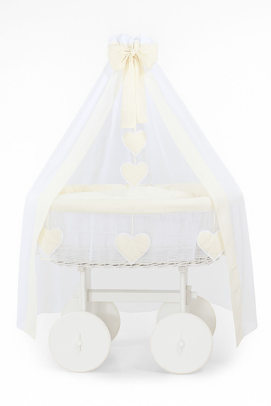 - Obszycie 3-warstwowe kosza z miękką włókniną, wykończone wokół kosza falbaną z sercami, zdejmowane do prania