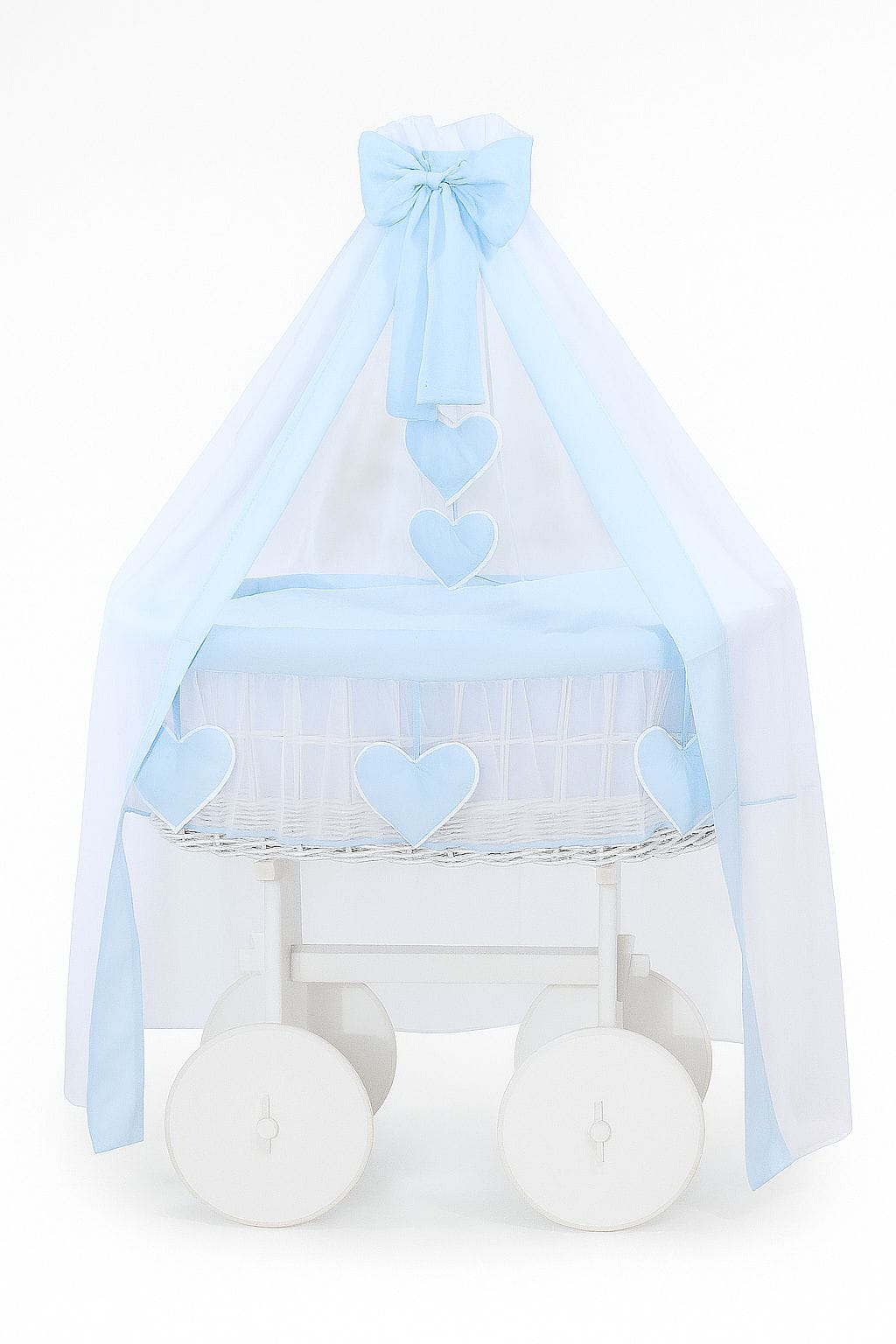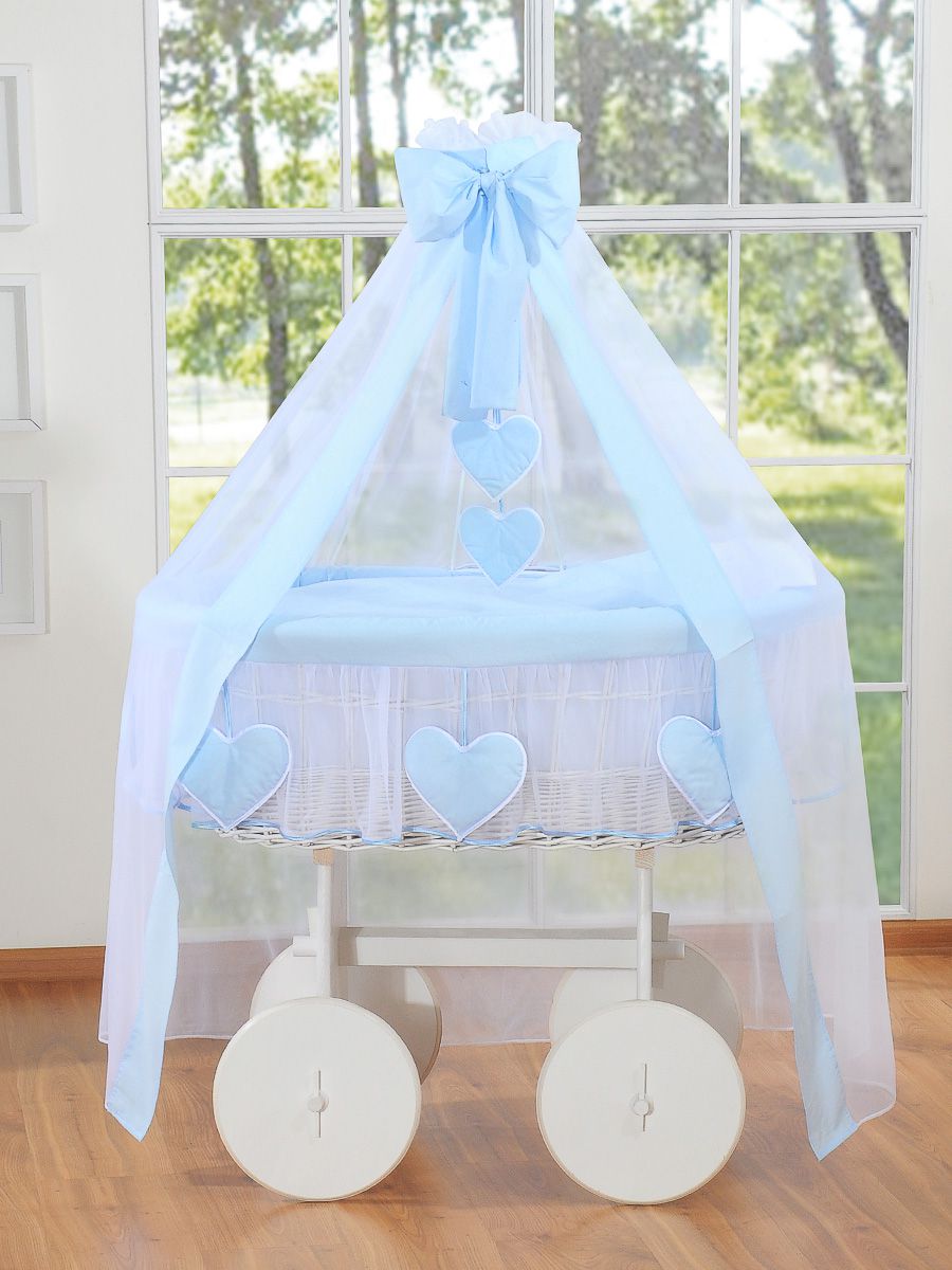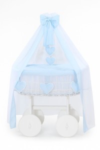 Wiklinowy kosz Mojżesza z baldachimem Deluxe Amelia - biały + niebieska pościel