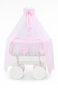 - Obszycie 3-warstwowe kosza z miękką włókniną, wykończone wokół kosza falbaną z sercami, zdejmowane do prania