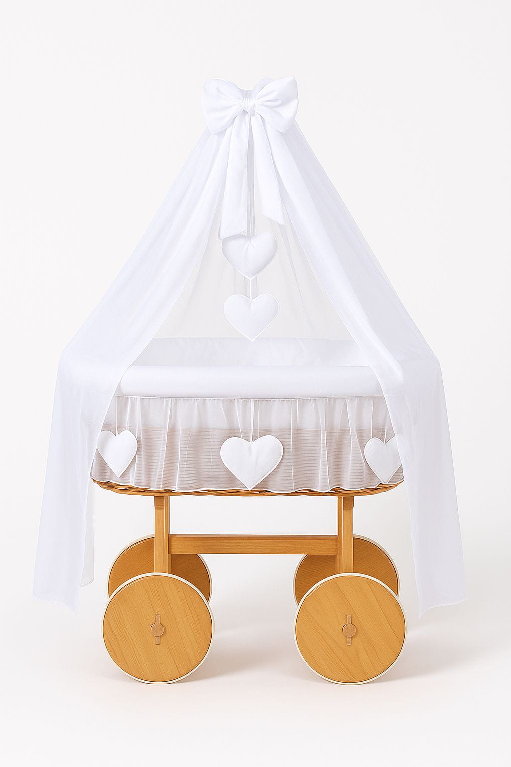 - Obszycie 3-warstwowe kosza z miękką włókniną, wykończone wokół kosza falbaną z sercami, zdejmowane do prania